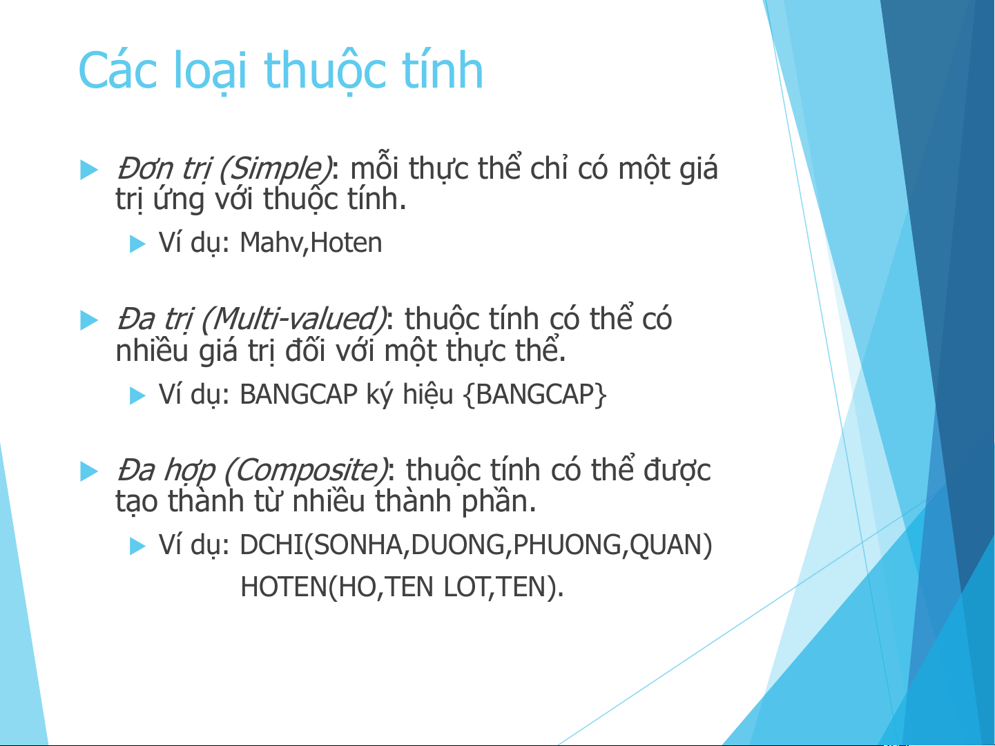 u Ví dụ: DCHI(SONHA,DUONG,PHUONG,QUAN) HOTEN(HO,TEN LOT,TEN). Các loại thuộc tính (tt)