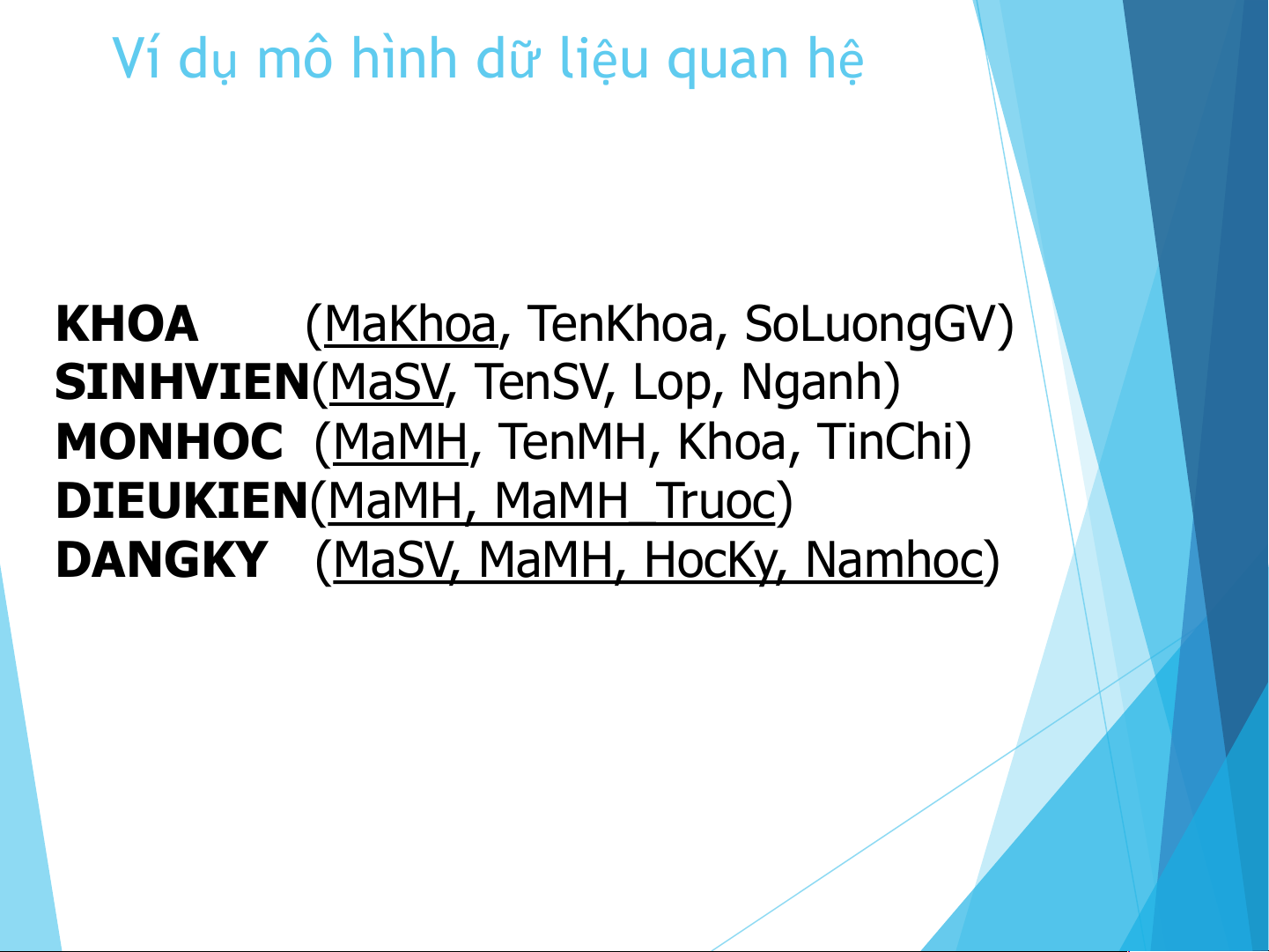 SINHVIEN(MaSV, TenSV, Lop, Nganh)