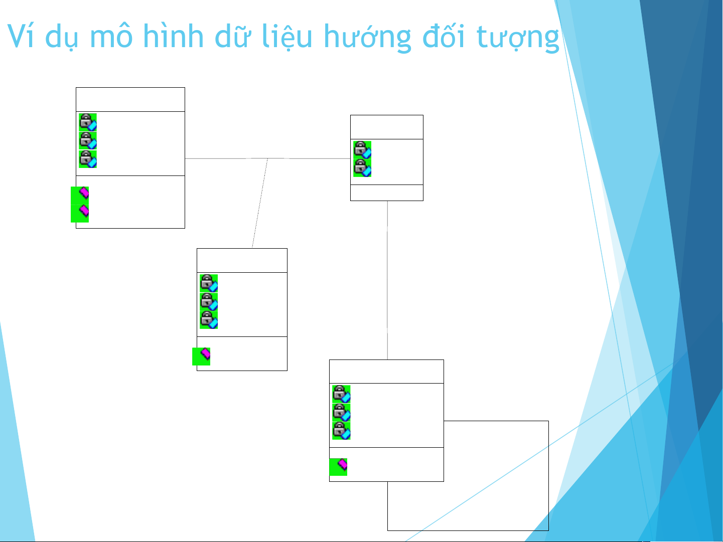 Ví dụ mô hình dữ liệu hướng đối tượng SVien Ten HPhan Lop hoc Ten Nganh SLuong 1.. 1. * . 0.. 0. * . LapTKB() InBangDiem() 1 Diem mo DiemTH DiemLT DiemPrj 0.. 0. * . SuaDiem() MHoc Ten Khoa +MHoc truoc SoTinChi 0.. 0. * . CapNhatSTC() 0.. 0. * Dieu kien .* +MHoc sau Mô hình dữ liệu mạng