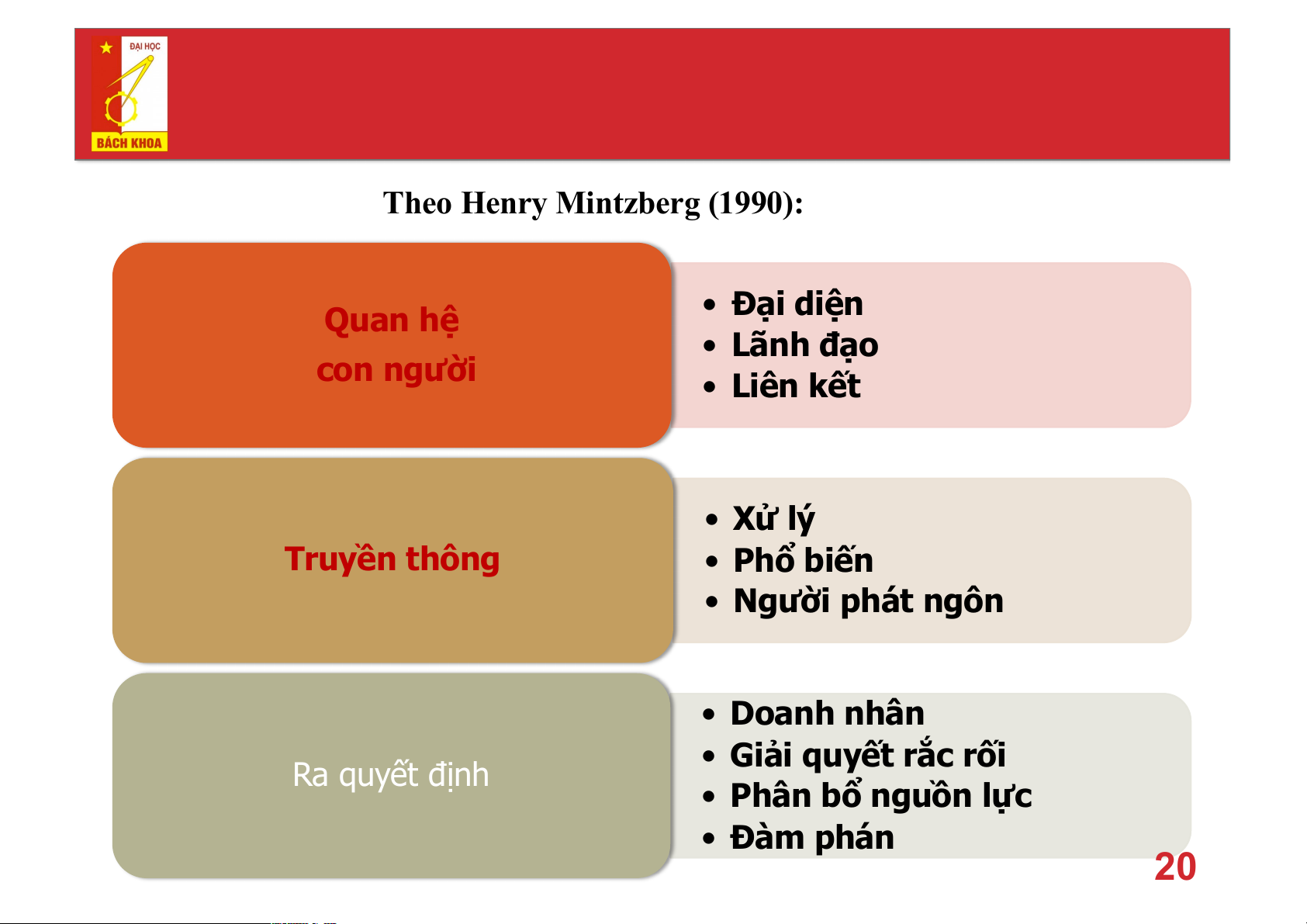 Theo Henry Mintzberg (1990): • Đại diện Quan hệ • Lãnh đạo con người • Liên kết • Xử lý Truyền thông • Phổ biến