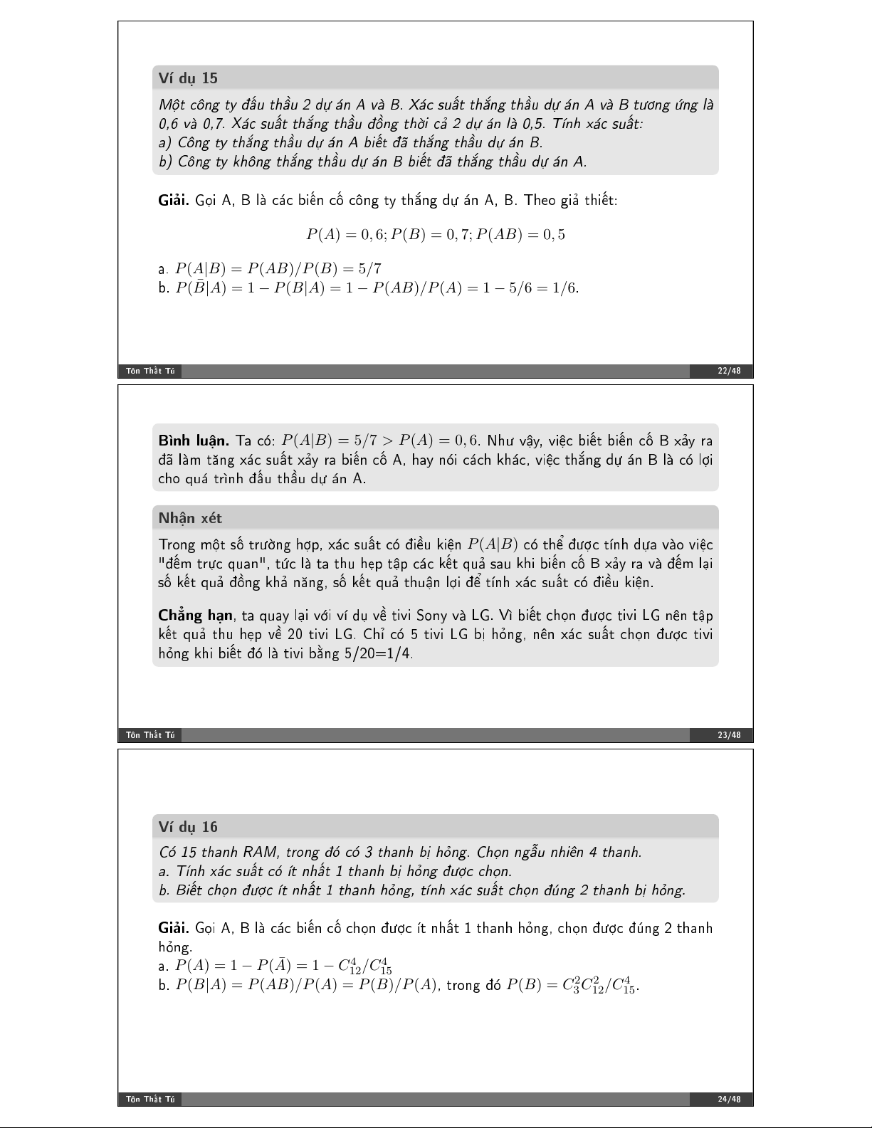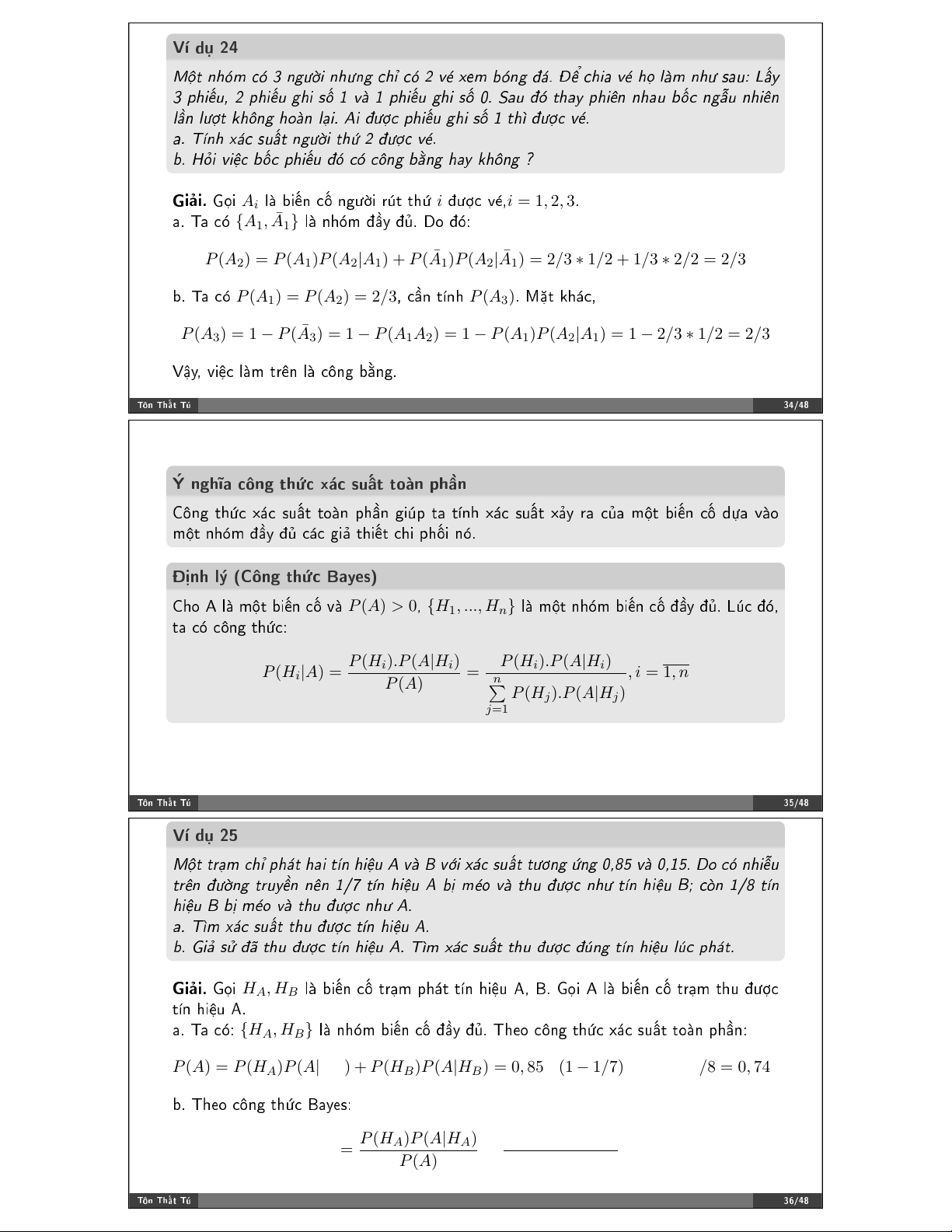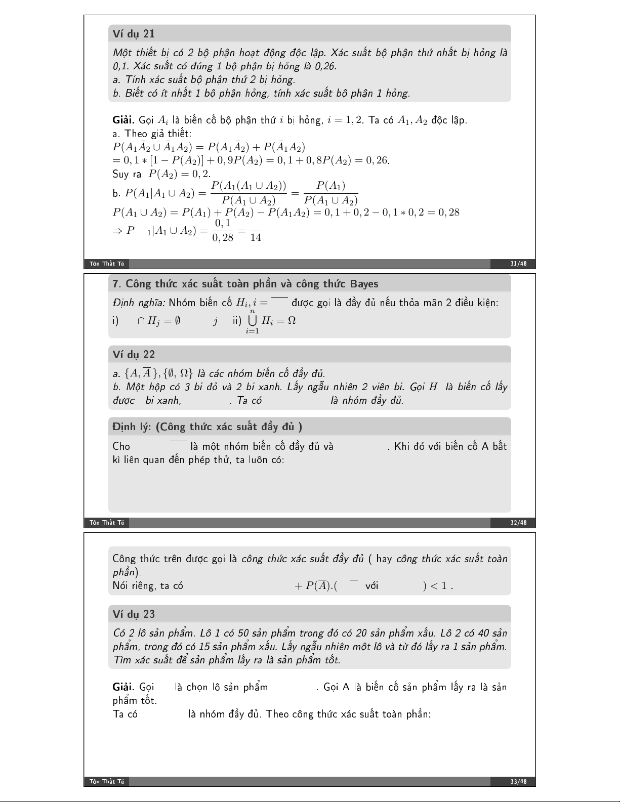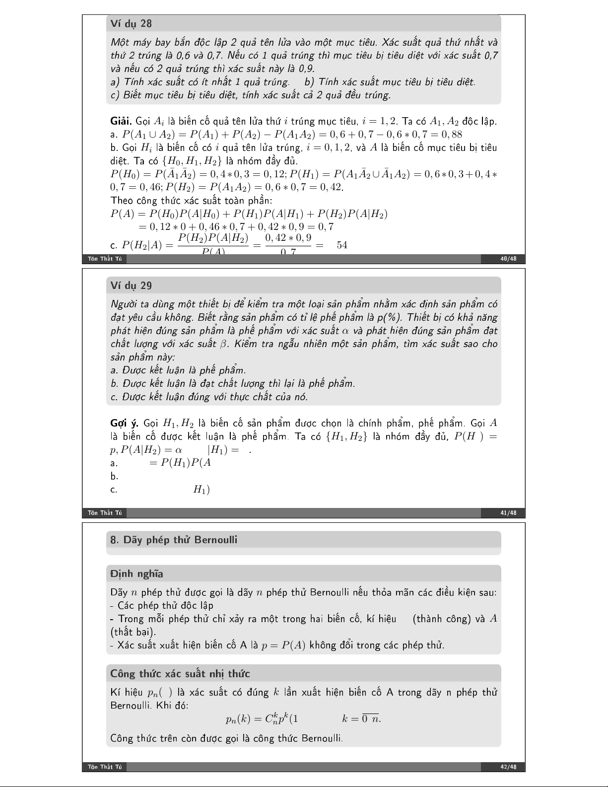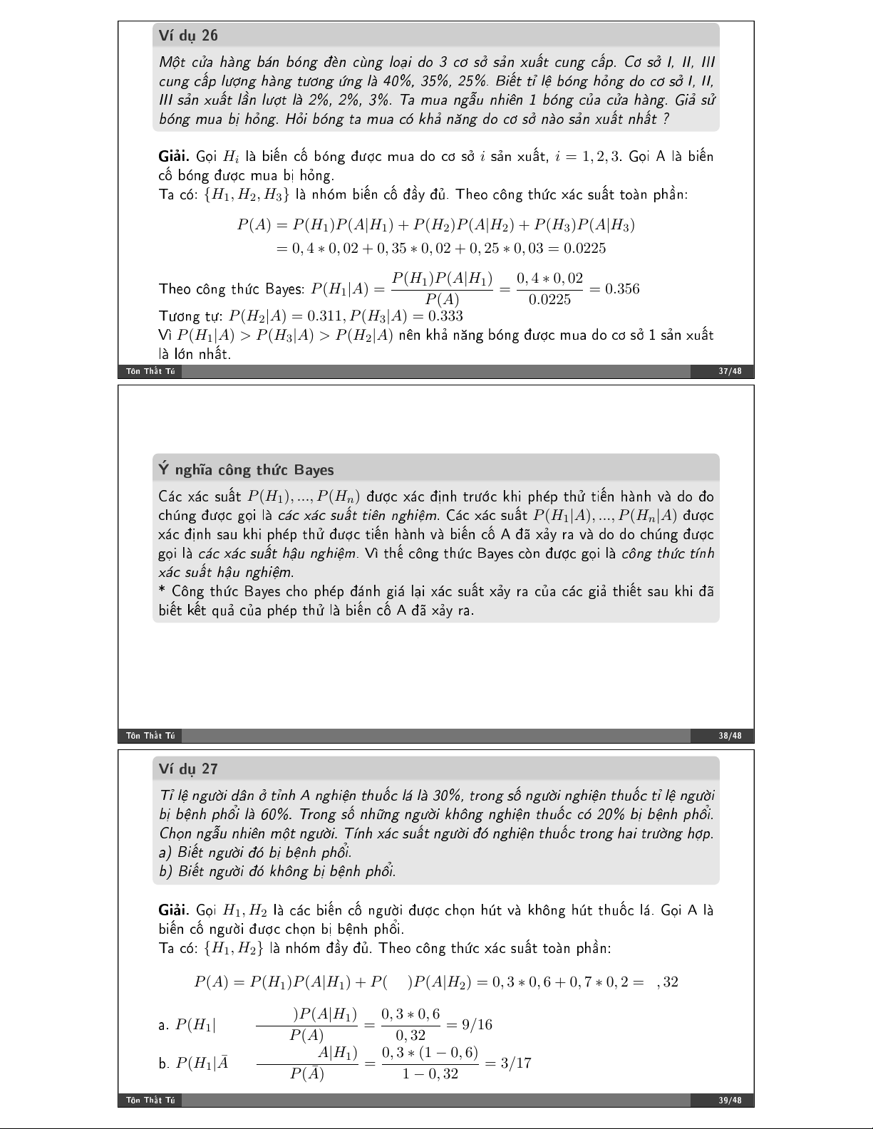 = 0, 12 ∗ 0 + 0, 46 ∗ 0, 7 + 0, 42 ∗ 0, 9 = 0, 7 ❝✳ P (H 0, 42 ∗ 0, 9 P (H 2)P (A|H2) 2|A) = = = 0, 54 P (A) 0, 7 ❚!♥ ❚❤➜% ❚& ✹✵✴✹✽ ❱➼ ❞# ✷✾