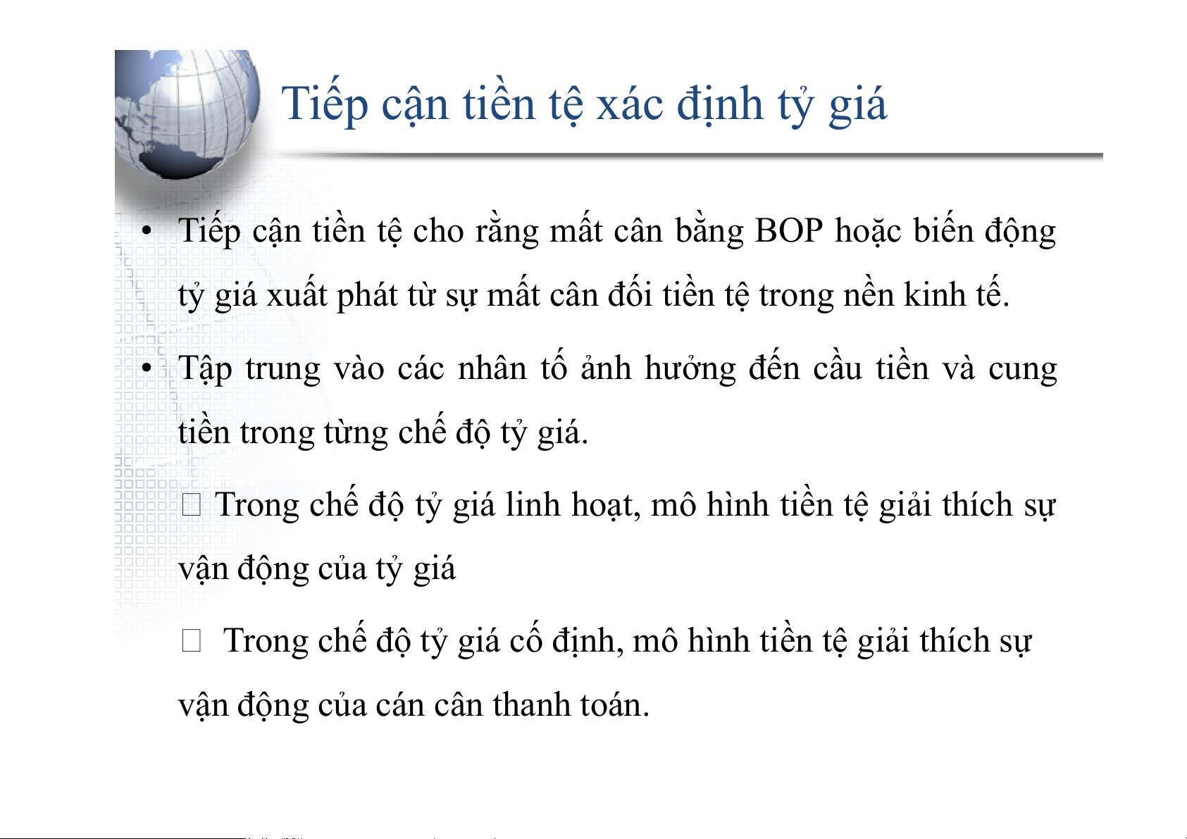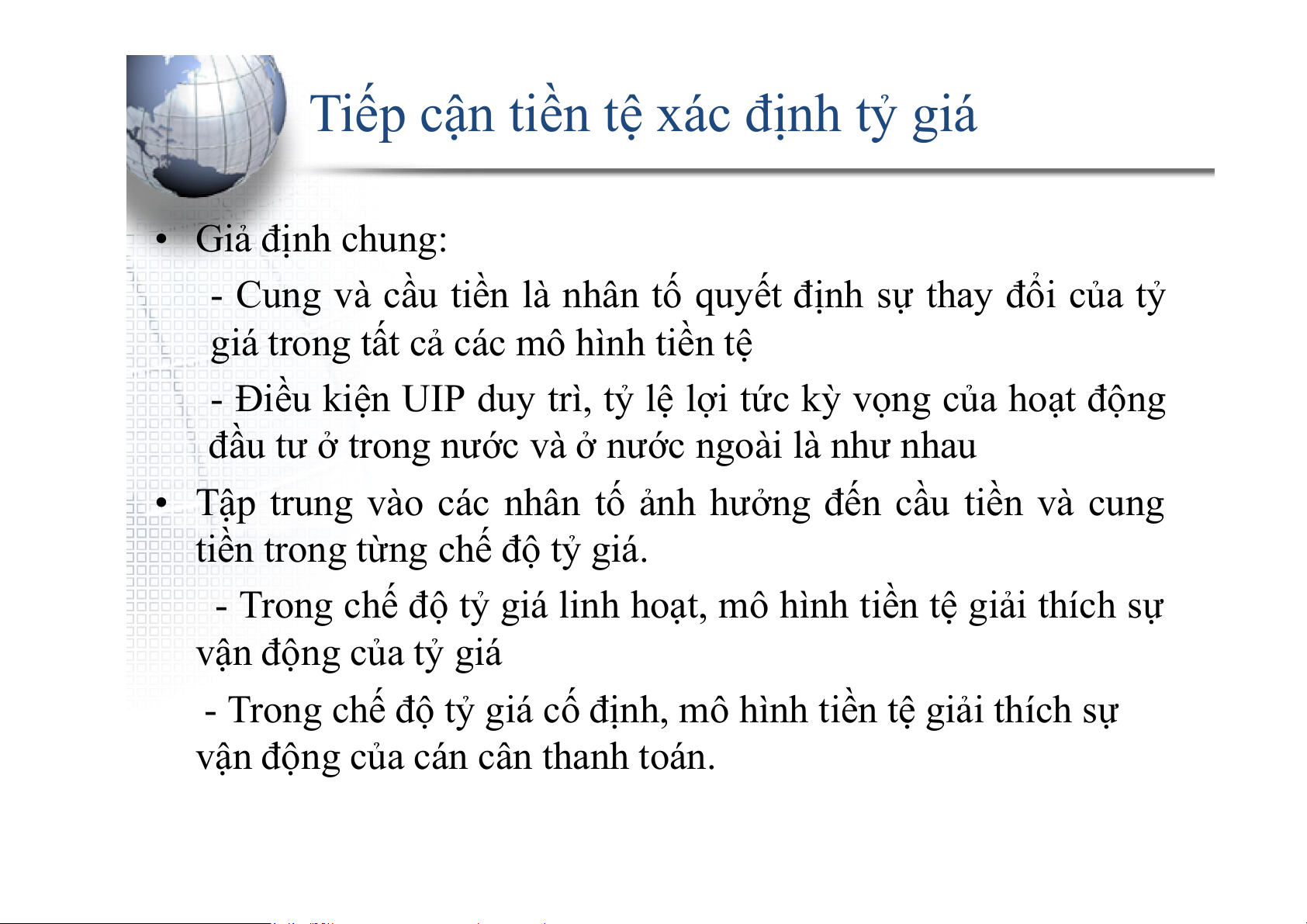 - Trong chế độ tỷ giá linh hoạt, mô hình tiền tệ giải thích sự vận động của tỷ giá