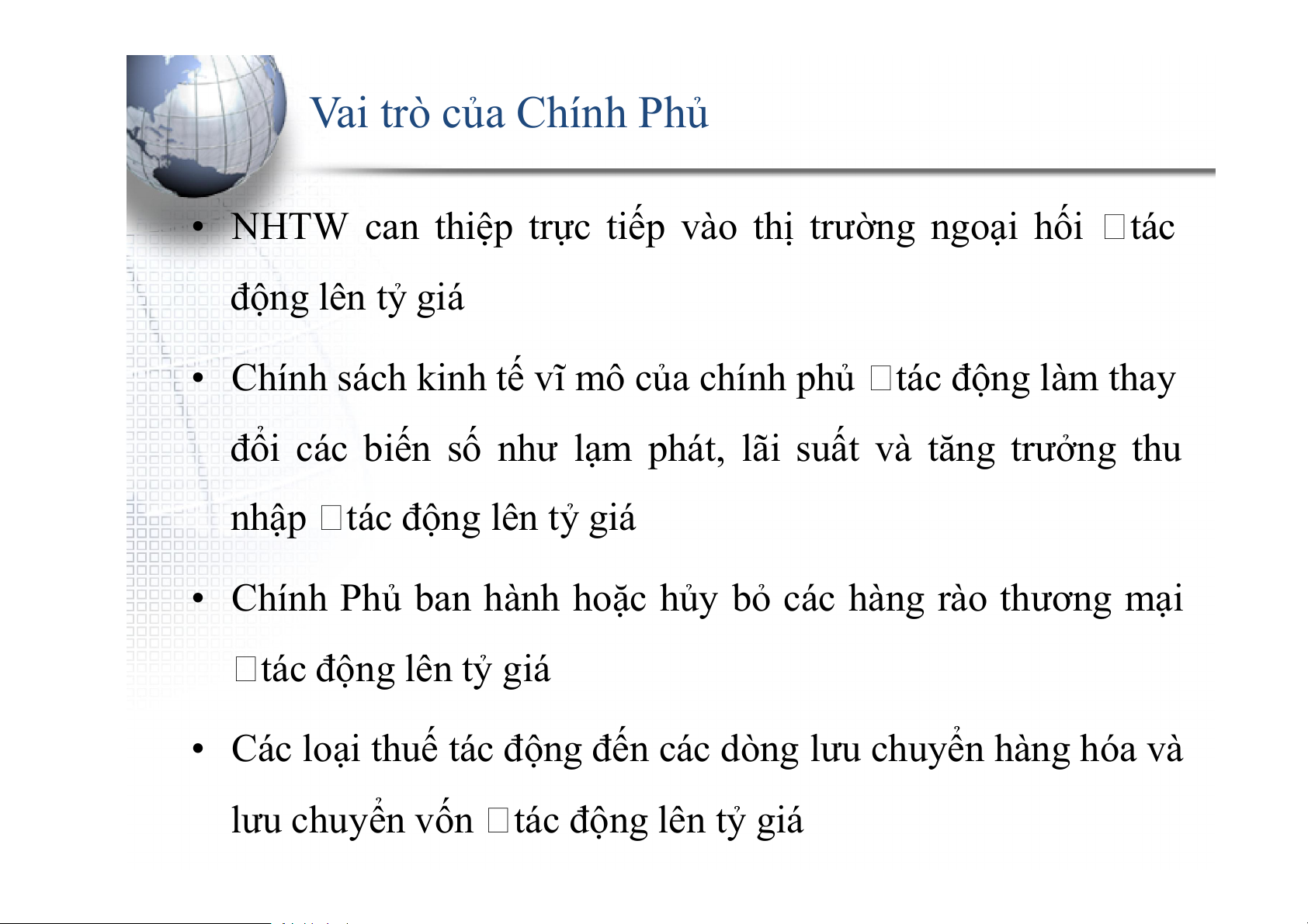 • Chính Phủ ban hành hoặc hủy bỏ các hàng rào thương mại tác động lên tỷ giá