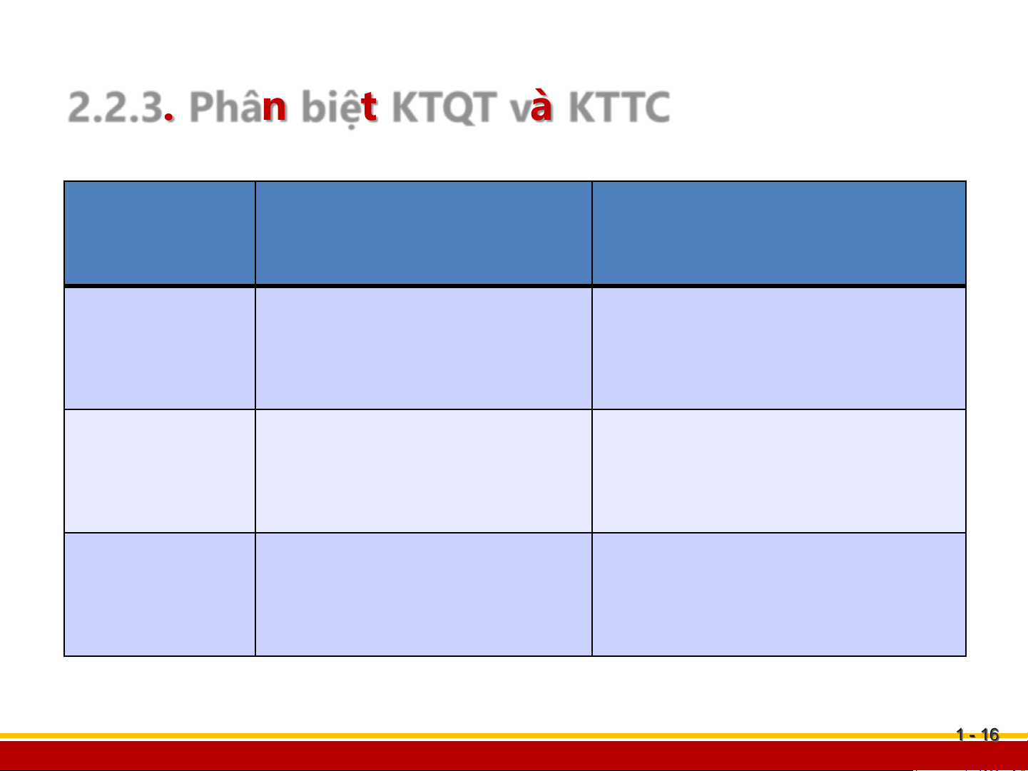 2.2.3. Phân biệt KTQT và KTTC Tiêu chí Kế toán tài chính Kế toán quản trị Đặc điểm Chủ yếu là thông