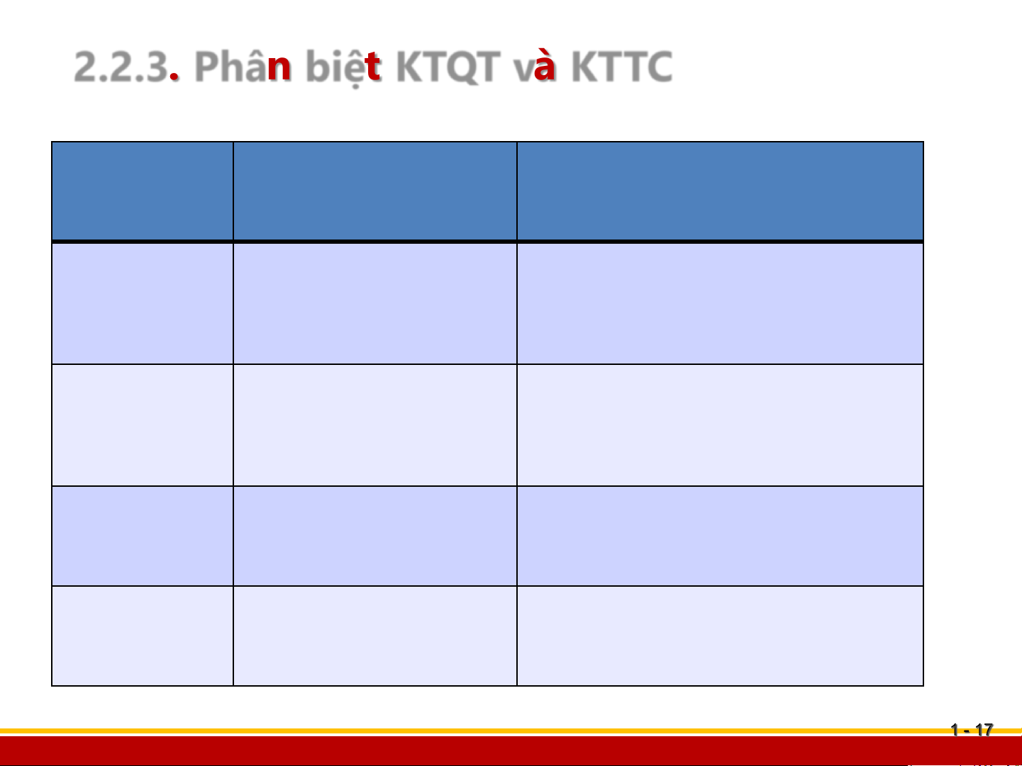 2.2.3. Phân biệt KTQT và KTTC Tiêu chí Kế toán tài chính Kế toán quản trị Mục đích
