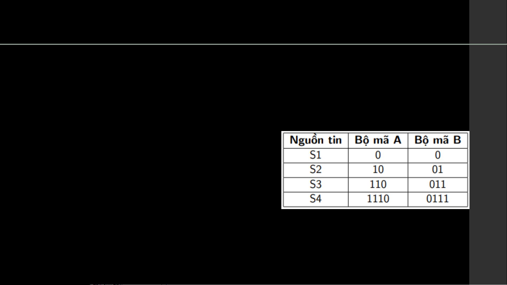 Ví dụ: Cho nguồn tin S được mã hóa thành 2 bộ mã khác nhau theo bảng sau: