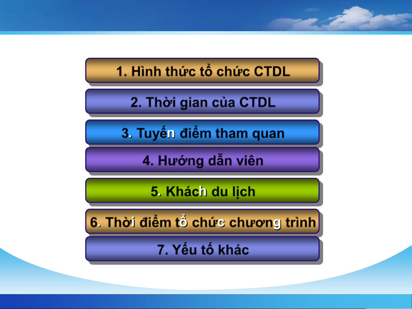 3. Tuyến điểm tham quan 4. Hướng dẫn viên 5. Khách du lịch