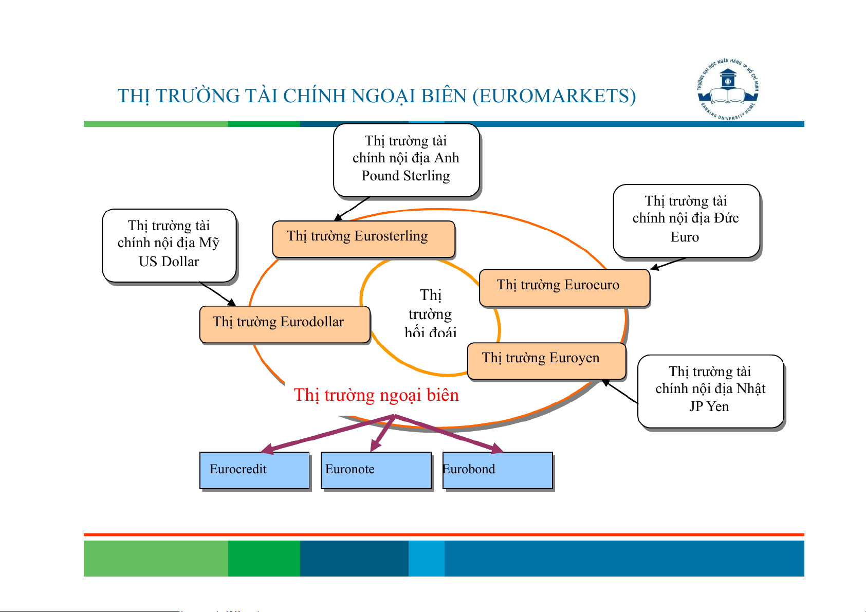 THỊ TRƯỜNG TÀI CHÍNH NGOẠI BIÊN (EUROMARKETS) Thị trường tài chính nội địa Anh Pound Sterling Thị trường tài Thị trường tài chính nội địa Đức chính nội địa Mỹ Thị trường Eurosterling Euro US Dollar Thị trường Euroeuro Thị Thị trường Eurodollar trường hối đoái Thị trường Euroyen Thị trường tài Thị trường ngoại biên chính nội địa Nhật JP Yen Eurocredit Euronote Eurobond