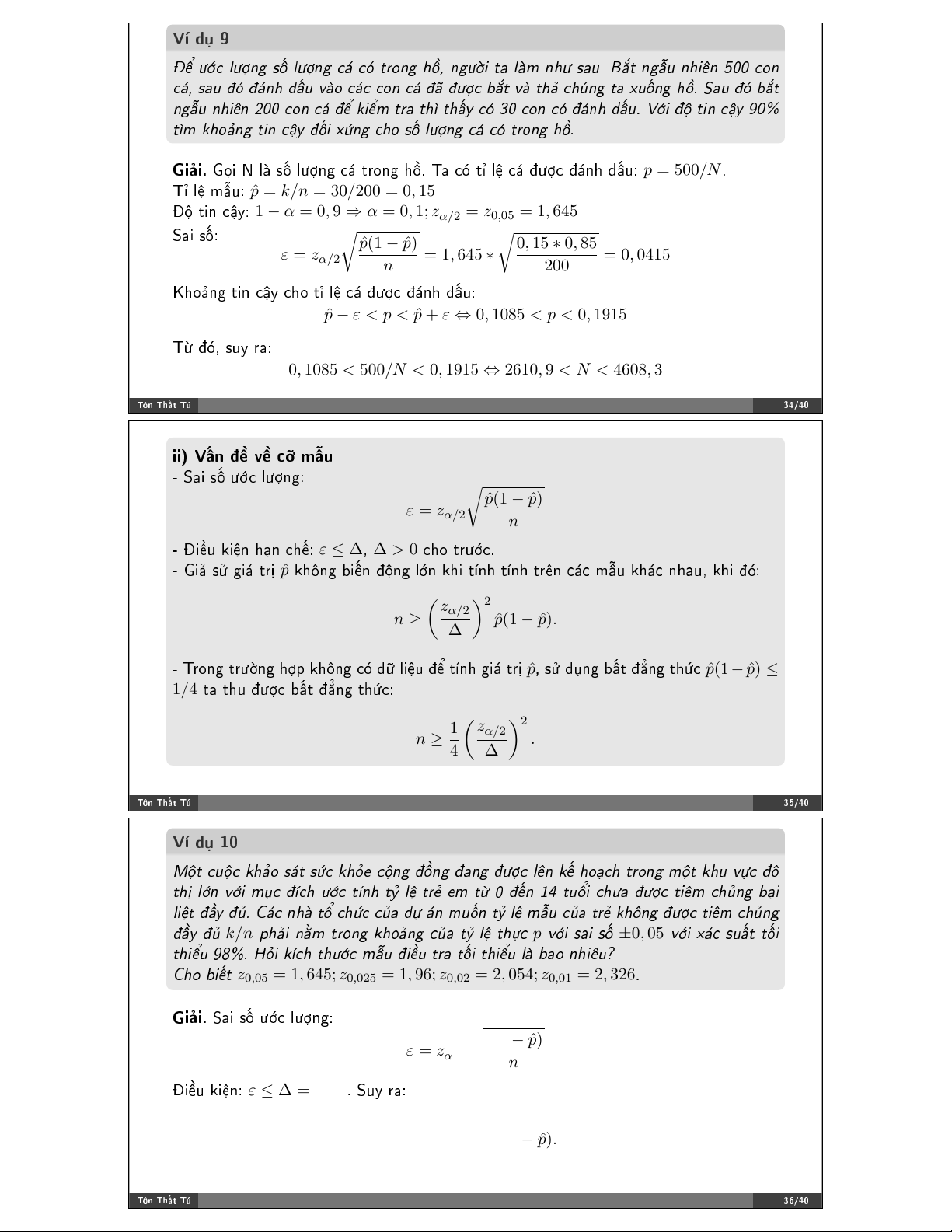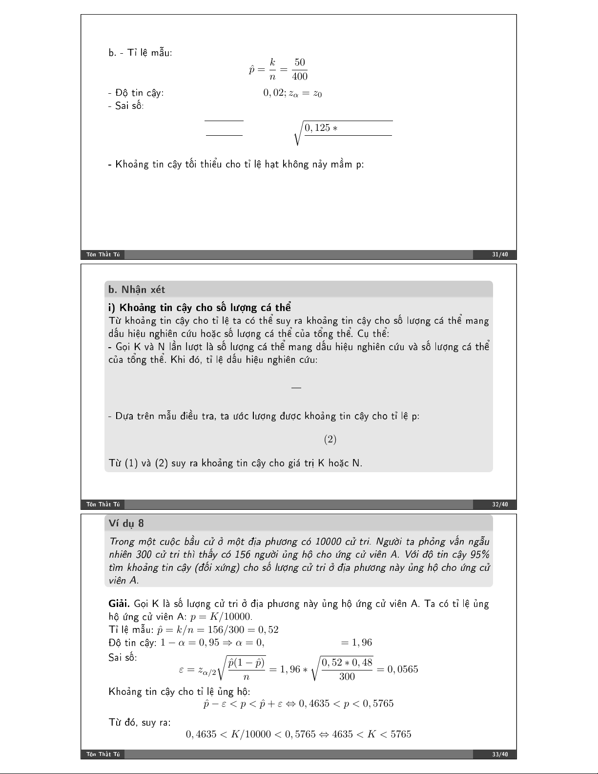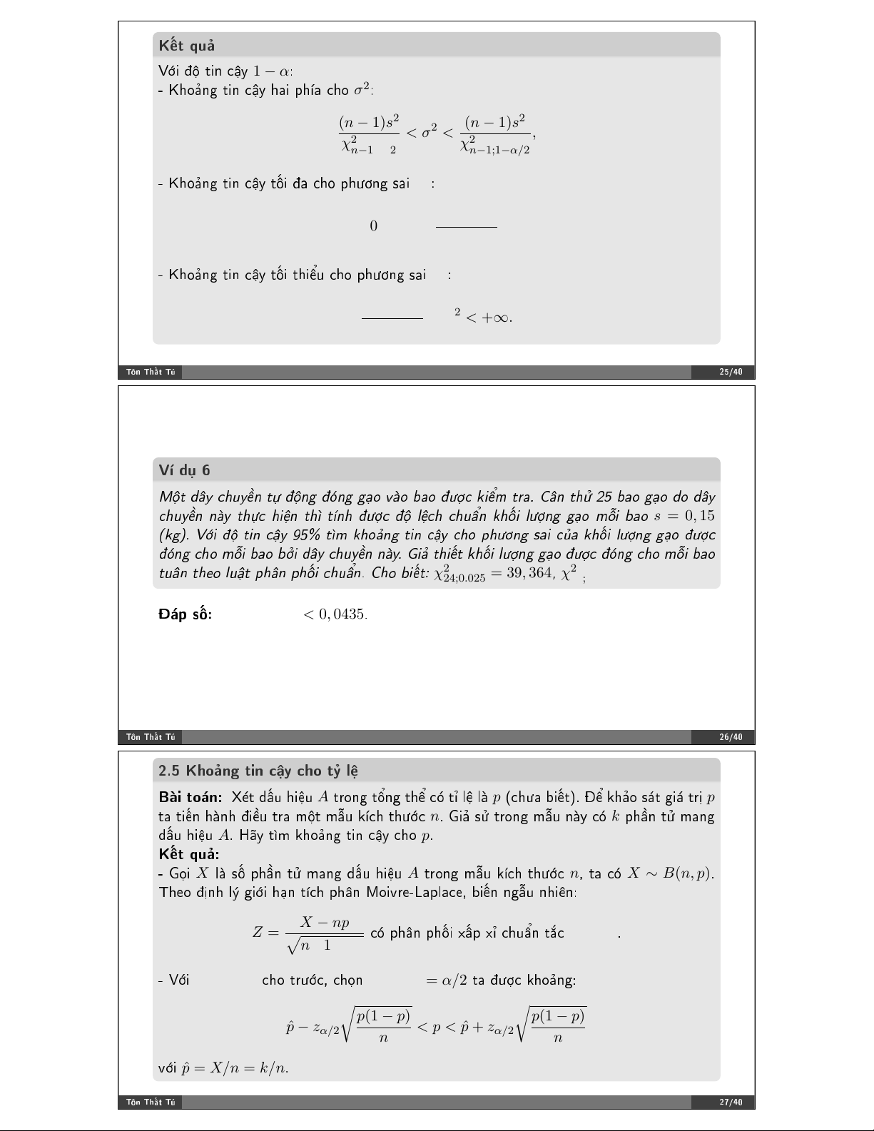 ✲ ❱!✐ α ∈ (0; 1) ❝❤♦ %@5!❝✱ ❝❤W♥ α1 = α2 = α/2 %❛ ✤5e❝ ❦❤♦↔♥❣✿ r r p(1 − p) p(1 − p) ˆ p − zα/2 < p < ˆ p + z n α/2 n ✈!✐ ˆp = X/n = k/n✳ ❚!♥ ❚❤➜% ❚& ✷✼✴✹✵ ❚!♥ ❚❤➜% ❚& ✷✽✴✹✵