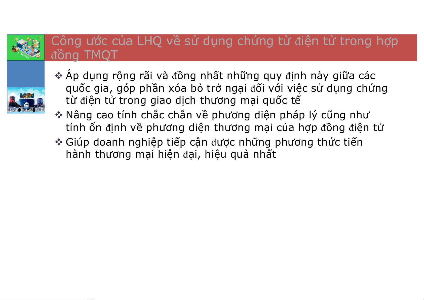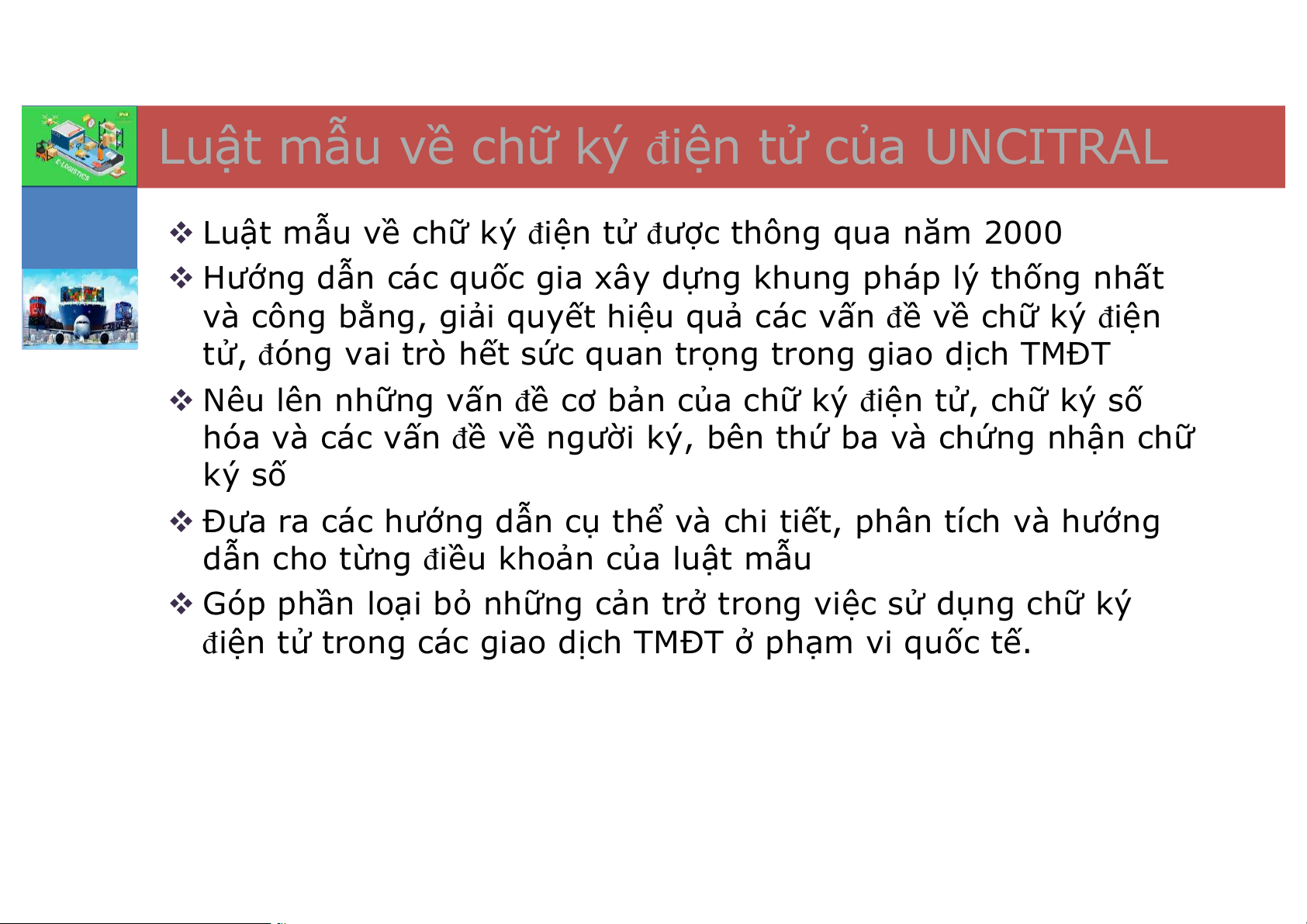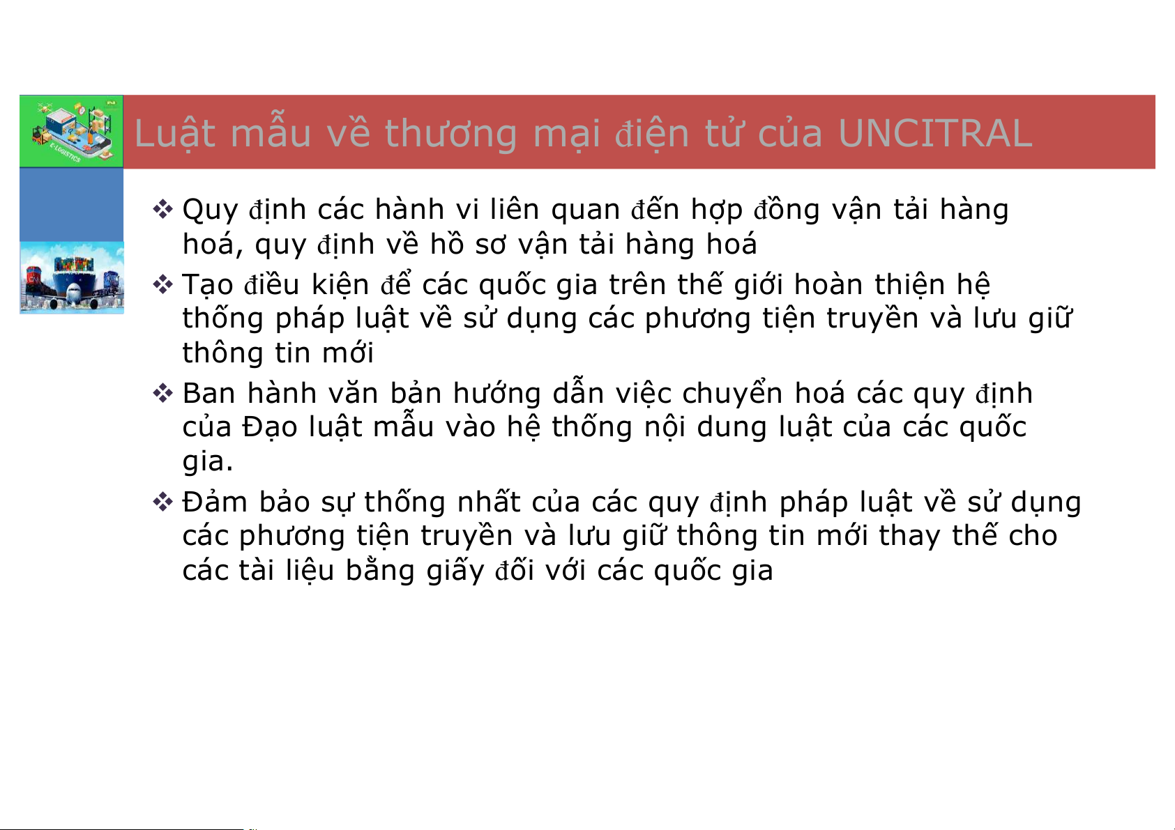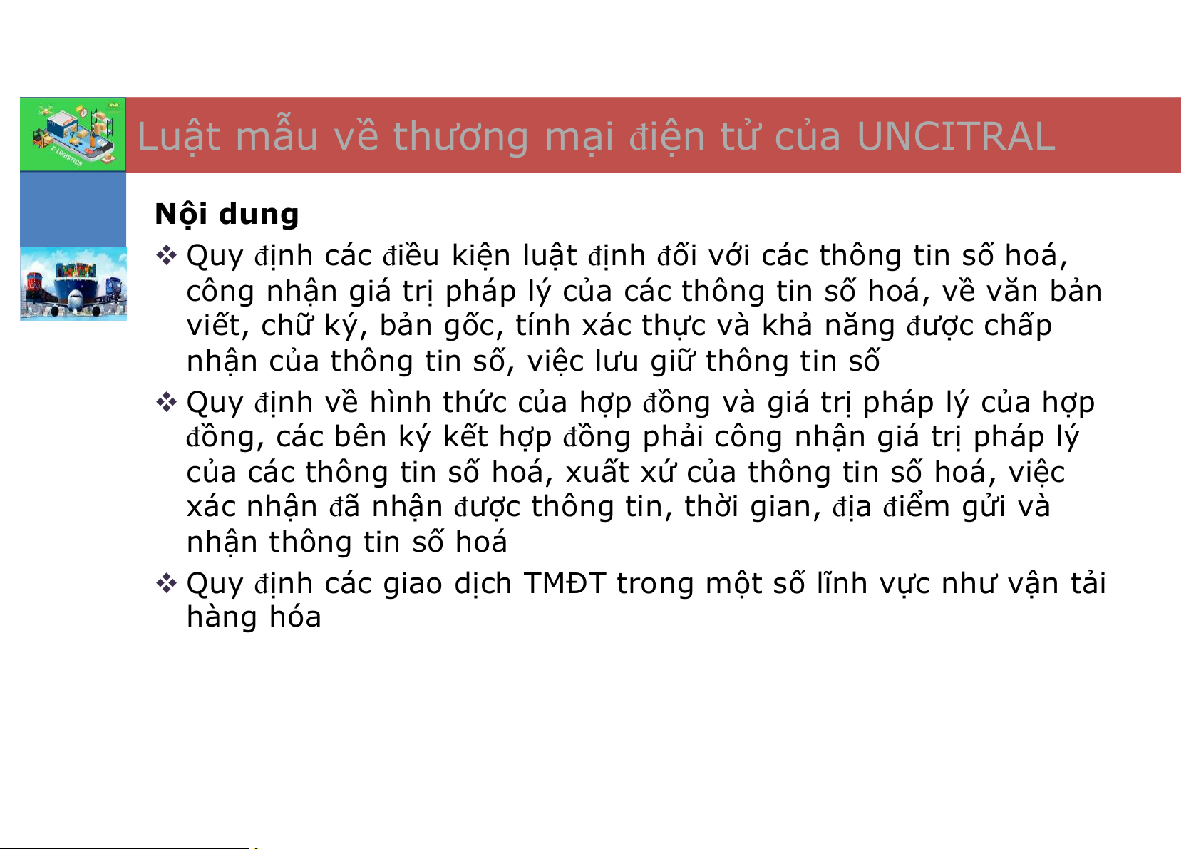 Chương 6: Cơ sở sở pháp lý của E-logistics Luật mẫu của Luật giao Các văn Một số vấn UNCITRAL đề dịch điện bản pháp pháp lý và luật giao Luật mẫu tử của một quy liên liên quan dịch điện của số quốc gia quan tới E- tới E- tử của một UNCITRAL trên thế Logistics tại Logistics số quốc gia giới Việt Nam trên thế giới Tài liệu tham khảo