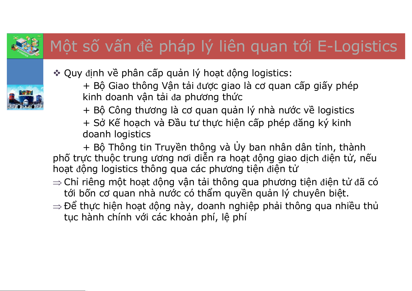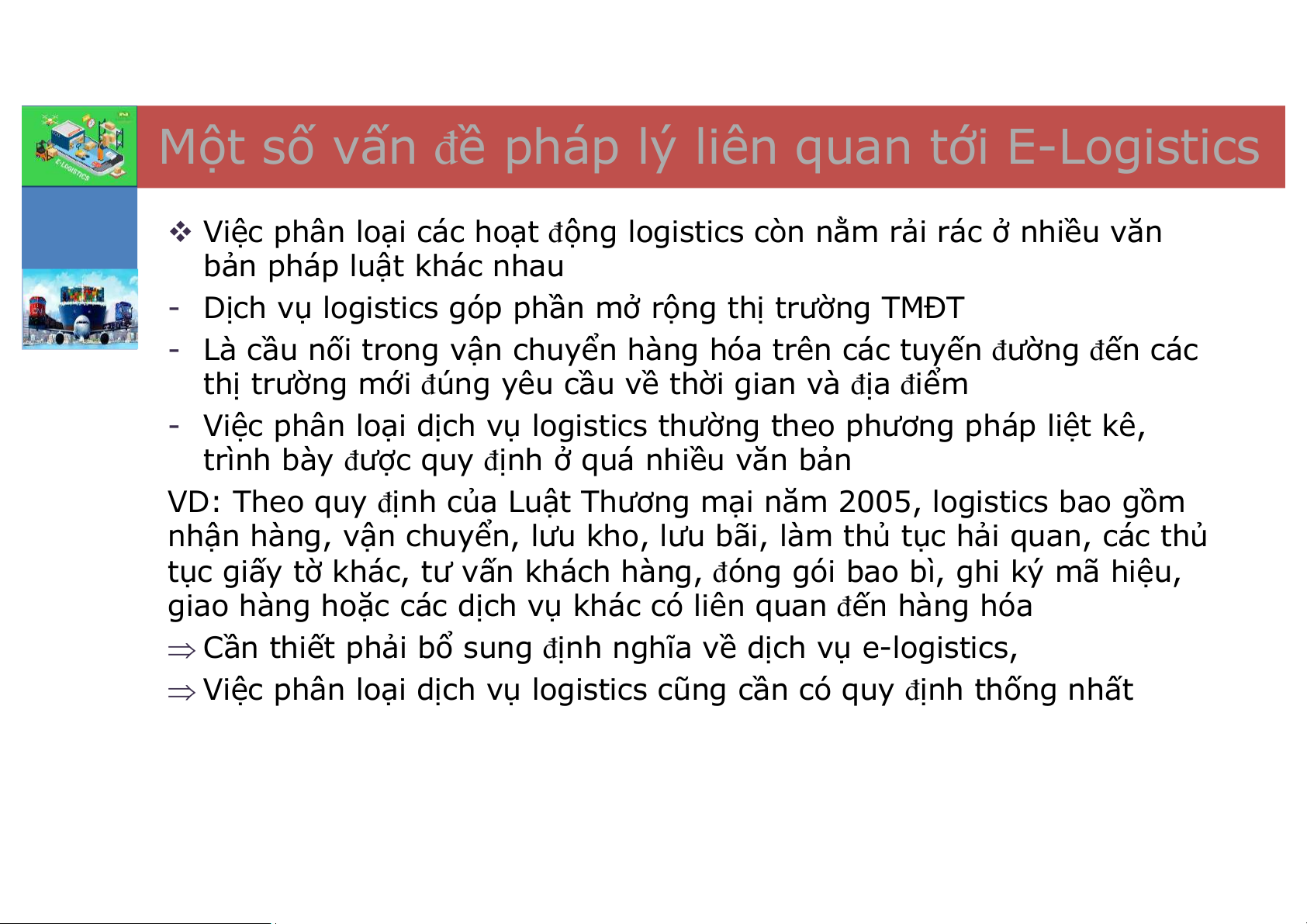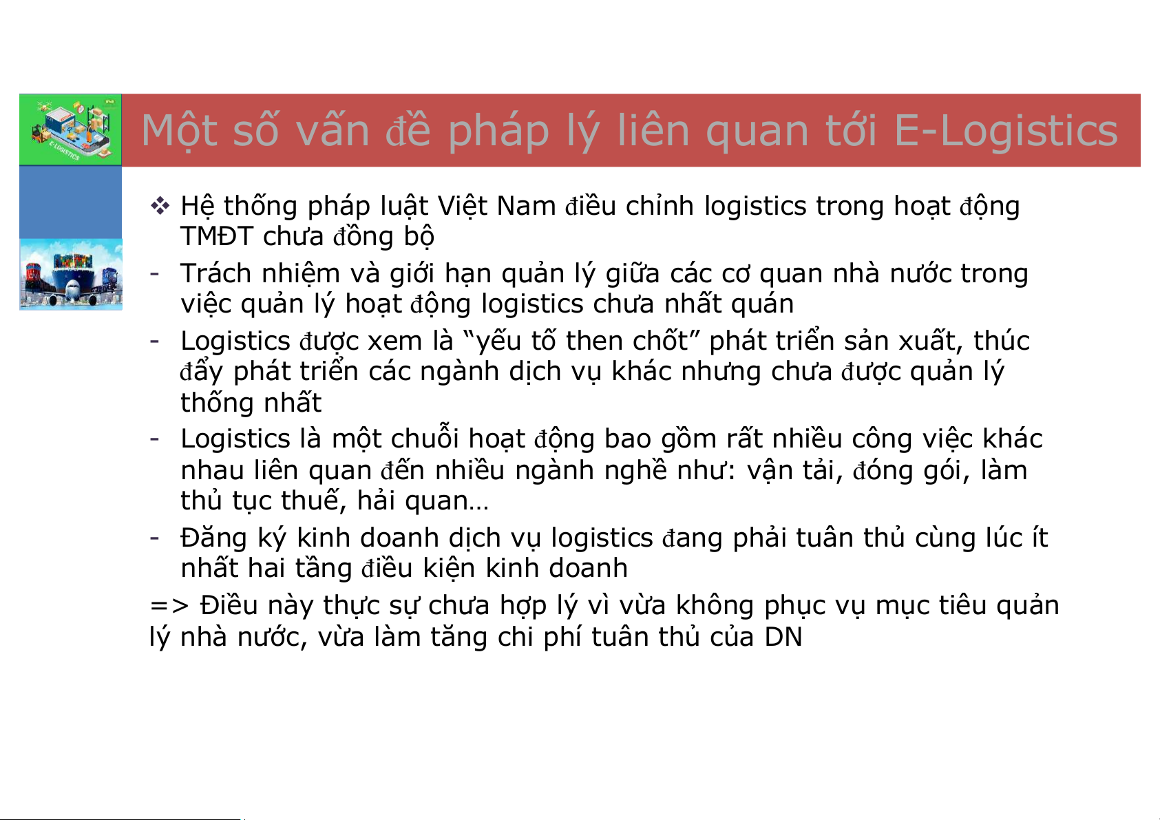 v Hệ thống pháp luật Việt Nam điều chỉnh logistics trong hoạt động TMĐT chưa đồng bộ
