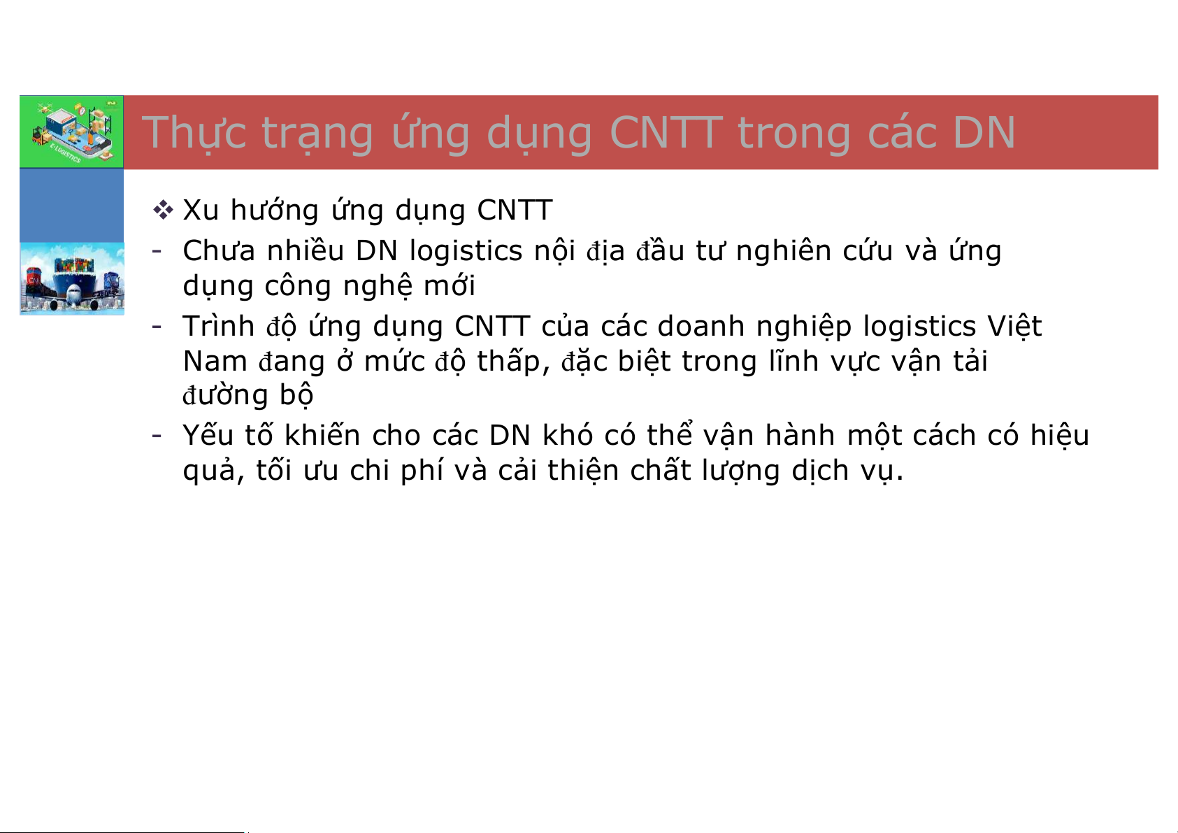 - Chưa nhiều DN logistics nội địa đầu tư nghiên cứu và ứng dụng công nghệ mới