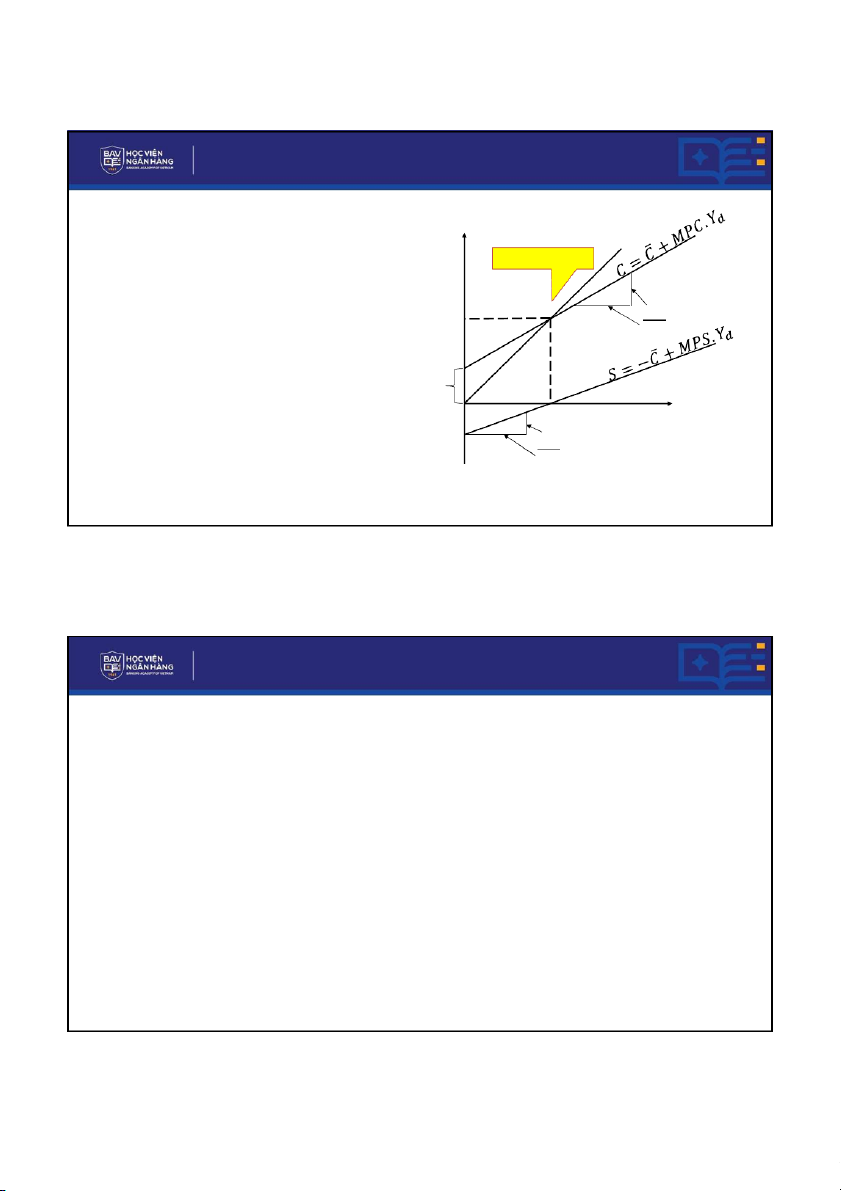 Tiêu dùng hộ gia đình (C) C450 •Hàm tiết kiệm (S): 𝑺 = −𝑪 + 𝑴𝑷𝑺 ∗ 𝒀𝒅 Điểm vừa đu Yd = C + S S = Yd - C E0 ∆𝐶 C