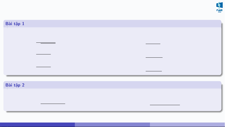 Giới hạn của hàm số nhiều biến số Bài tập 1 Tính lim f (x, y) với (x,y)→(0,0) xy a) f (x, y) = , 3x2y p d) f (x, y) = , x2 + y2 x2 + y2 xy b) f (x, y) = , x4 − 4y2 x2 + y2 e) f (x, y) = , x2 + 2y2 xy2 c) f (x, y) = , x2 + y4 y2 sin2 x f) f (x, y) = . x4 + y4 Bài tập 2 Tính lim f (x, y, z) với (x,y,z)→(0,0,0) xy + yz a) f (x, y, z) = , xy + yz2 + xz2 x2 + y2 + z2 b) f (x, y, z) = . x2 + y2 + z4 Khoa Toán-Tin (HUST) MI1111–Chương III 2024 12 / 48