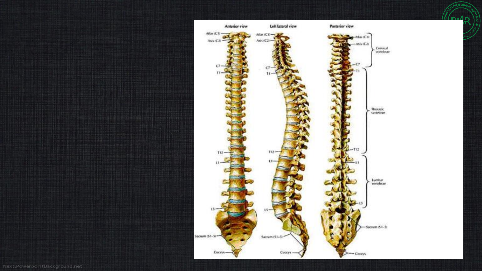 • Cột sống: 4 đoạn chính • Cổ: C1-7 • Ngực: T1-12 • Thắt lưng: L1-5 • Cùng: S1-5 1. Giải phẫu