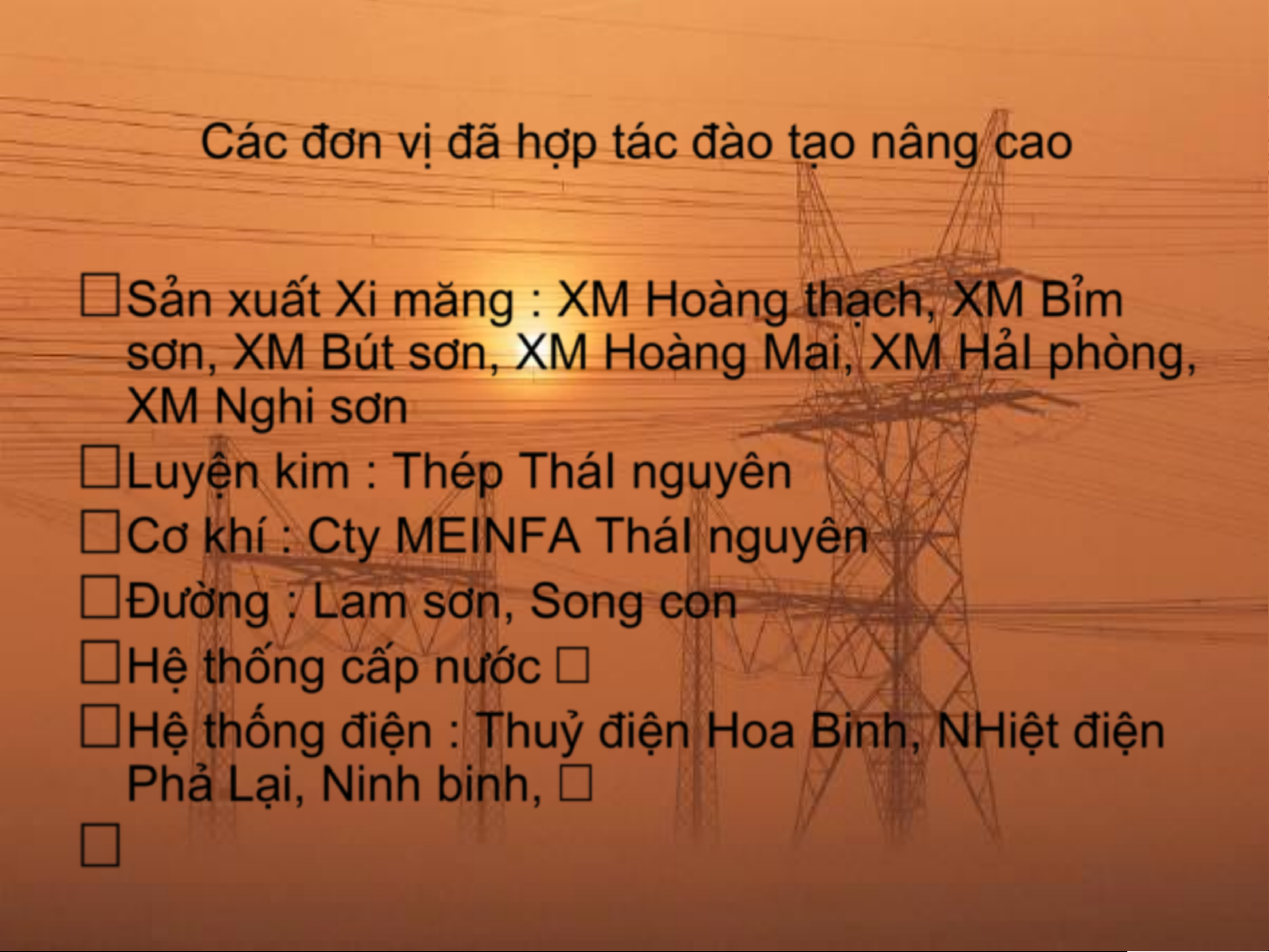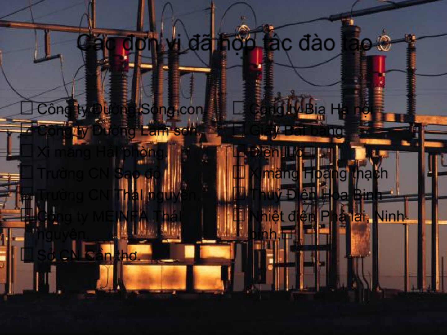C¸c ®¬n vÞ ®· hîp t¸c ®µo t¹o …C«ng ty §-êng S«ng con. …C«ng ty Bia Ha néi …C«ng ty §-êng Lam s¬n. …GiÊy B·I b»ng …Xi m¨ng H¶I phßng. …§iÖn lùc… …Tr-êng CN Sao ®á …Ximăng Hoang thạch …Tr-êng CN Th¸I nguyªn. …Thuỷ Điện Hoa Binh …C«ng ty MEINFA Th¸I