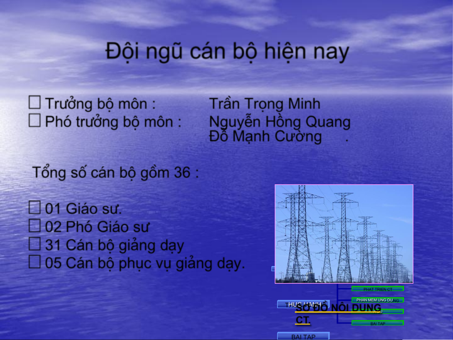 …Hu©n ch-¬ng Lao ®éng h¹ng III §éi ngò c¸n bé hiÖn nay …Tr-ëng bé m«n : TrÇn Träng Minh …Phã tr-ëng bé m«n : Nguyễn Hồng Quang Đỗ Mạnh Cường . Tæng sè c¸n bé gåm 36 : …01 Gi¸o s-. …02 Phã Gi¸o s- …31 C¸n bé gi¶ng d¹y