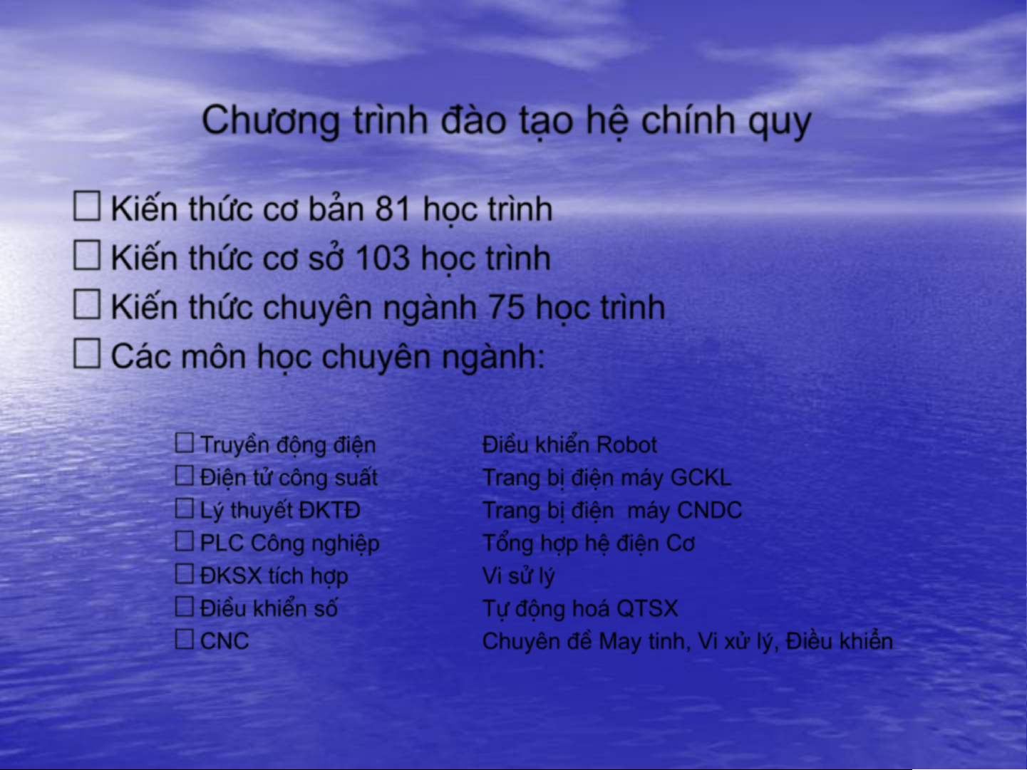 …C¸c m«n häc chuyªn ngµnh: …TruyÒn ®éng ®iÖn §iÒu khiÓn Robot …§iÖn tö c«ng suÊt Trang bÞ ®iÖn m¸y GCKL …Lý thuyÕt §KT§ Trang bÞ ®iÖn m¸y CNDC …PLC C«ng nghiÖp Tæng hîp hÖ ®iÖn C¬ …§KSX tÝch hîp Vi sö lý …§iÒu khiÓn sè Tù ®éng ho¸ QTSX …CNC