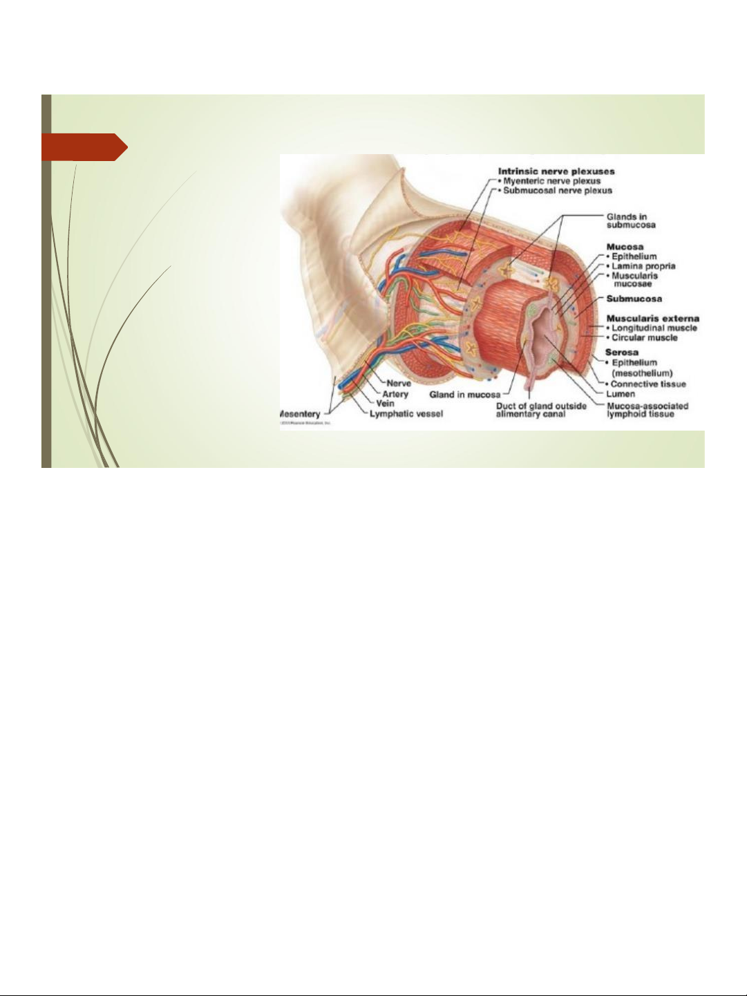 1. GIẢI PHẪU HỆ TIÊU HÓA lOMoAR cPSD| 46342819 11/13/2021 3 4 CÁC THÀNH PHẦN Ống tiêu hóa Các tuyến tiêu hóa Miệng Các tuyến nước bọt Hầu Gan – mật Thực quản Tụy ngoại tiết Dạ dày Ruột non Ruột già Hậu môn 5 lOMoAR cPSD| 46342819 11/13/2021 CHỨC NĂNG : Vận ộng Bàitiết Tiêu hóa Hấp thu Nộitiết 6 lOMoAR cPSD| 46342819 11/13/2021 CẤU TRÚC ỐNG TIÊU HÓA Niêm mạc Dưới niêm Cơ Thanh mạc lOMoAR cPSD| 46342819 11/13/2021 7 8