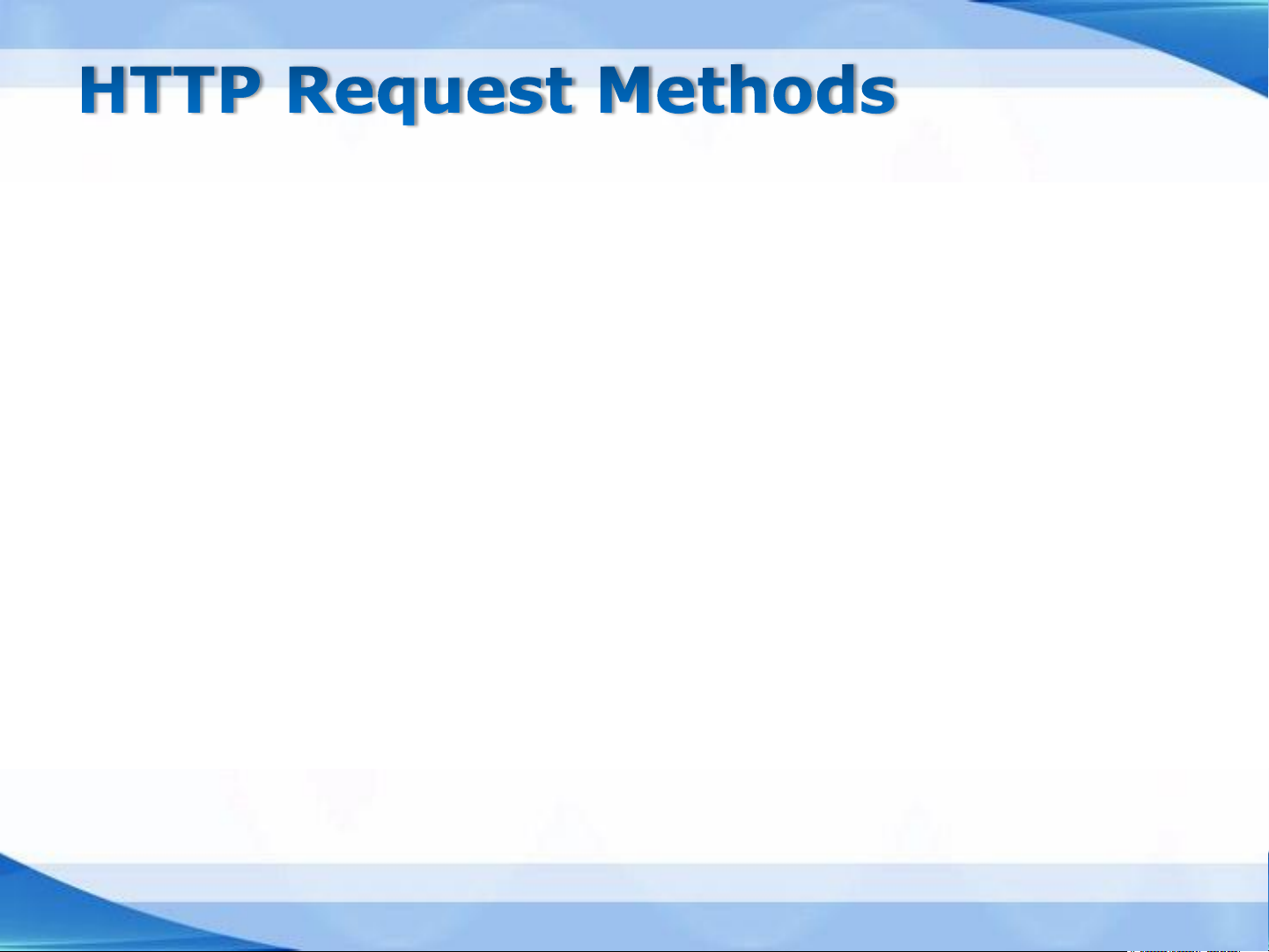 ... — document text (follows blank line) ❑ GET ❑ DELETE Retrieve a resource from the Remove a resource from the server (static file, or server dynamically-generated data) ❑ OPTIONS (HTTP 1.1) ❑ HEAD Request other options for an Get information about a URI (methods understood by a resource (but not the actual server or allowed for a given resource) URI) ❑ POST ❑ TRACE (HTTP 1.1) Client provides some Ask proxies to declare