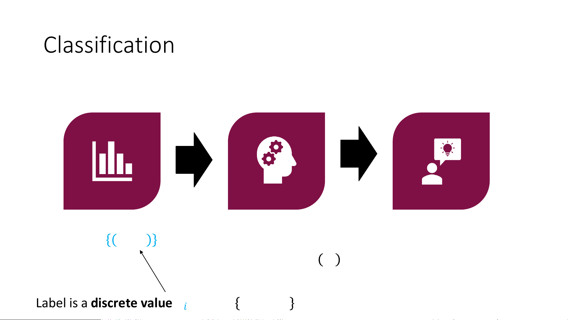 Label is a discrete value 𝑦𝑖 ∈ 𝒴 = 𝑐1, … , 𝑐𝑘 (Binary) Classification