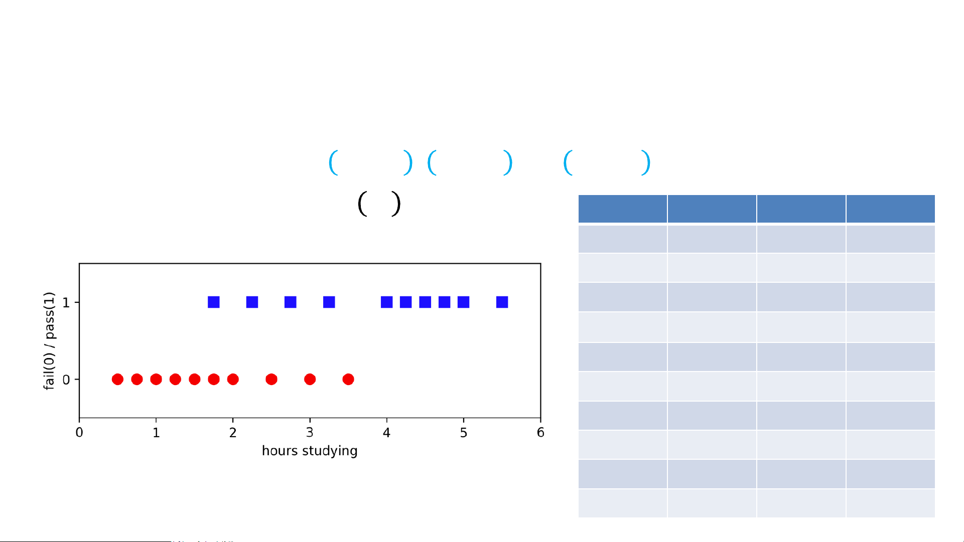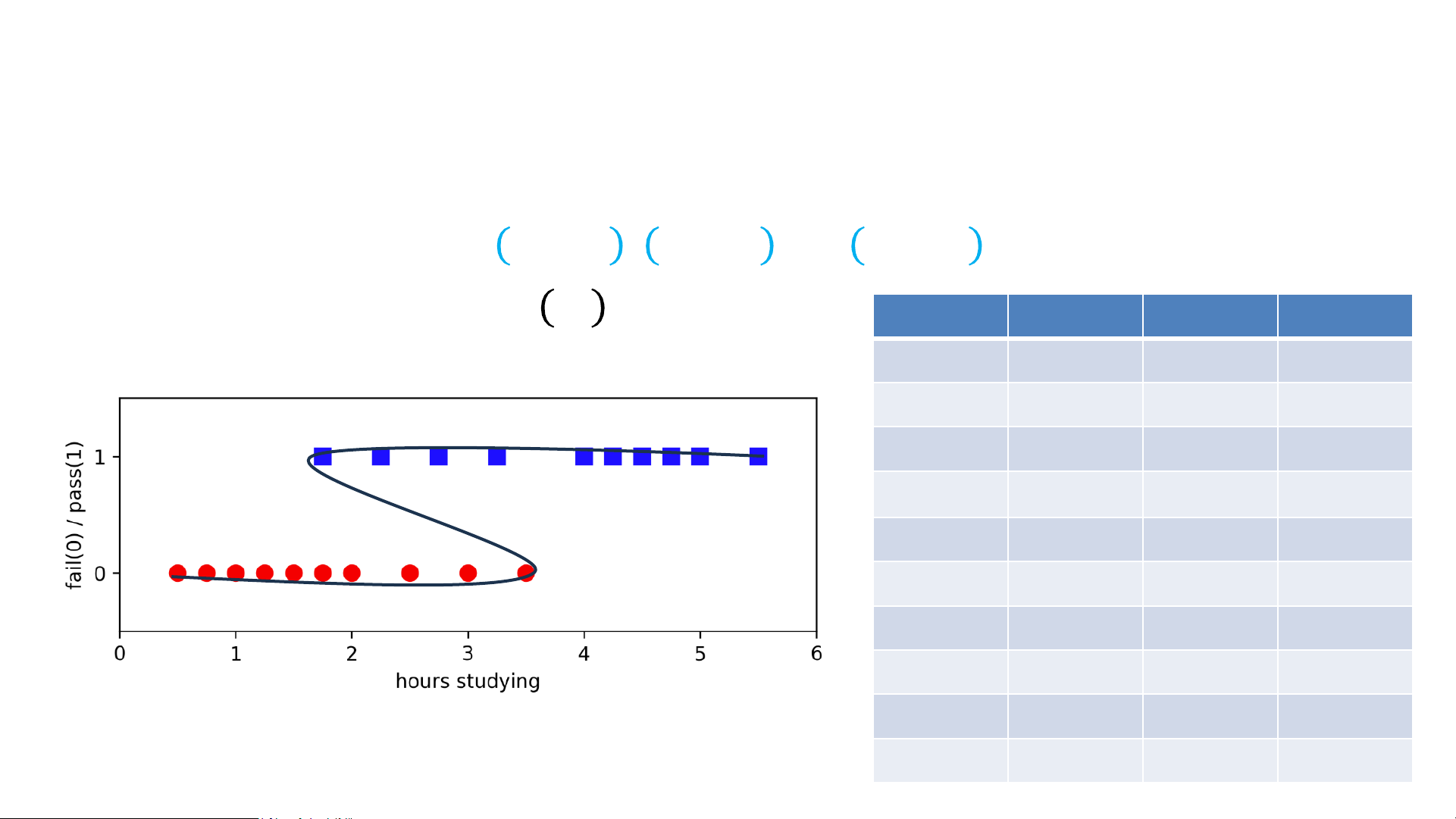 • Output: Model 𝑦𝑖 ≈ 𝑓𝜔 𝑥𝑖 Hours Pass Hours Pass .5 0 2.75 1 .75 0 3 0 1 0 3.25 1 1.25 0 3.5 0 1.5 0 4 1 1.75 0 4.25 1 1.75 1 4.5 1 2 0 4.75 1 2.25 1 5 1