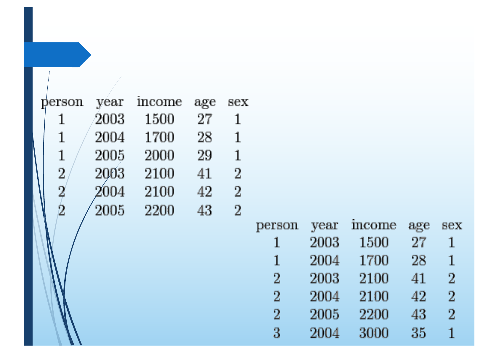 • Số liệu chéo (cross data): số liệu của nhiều biến số của những quan sát khác
