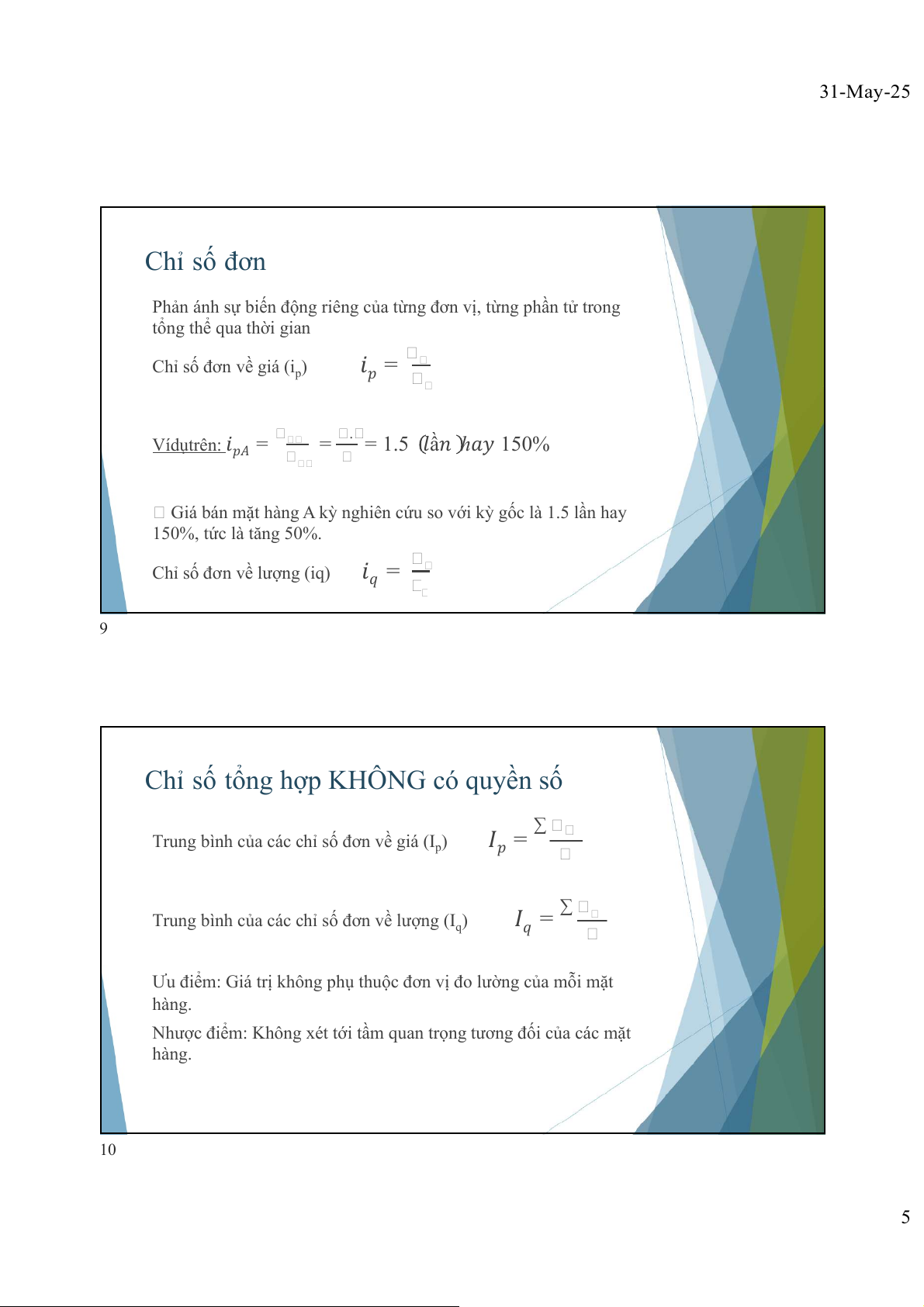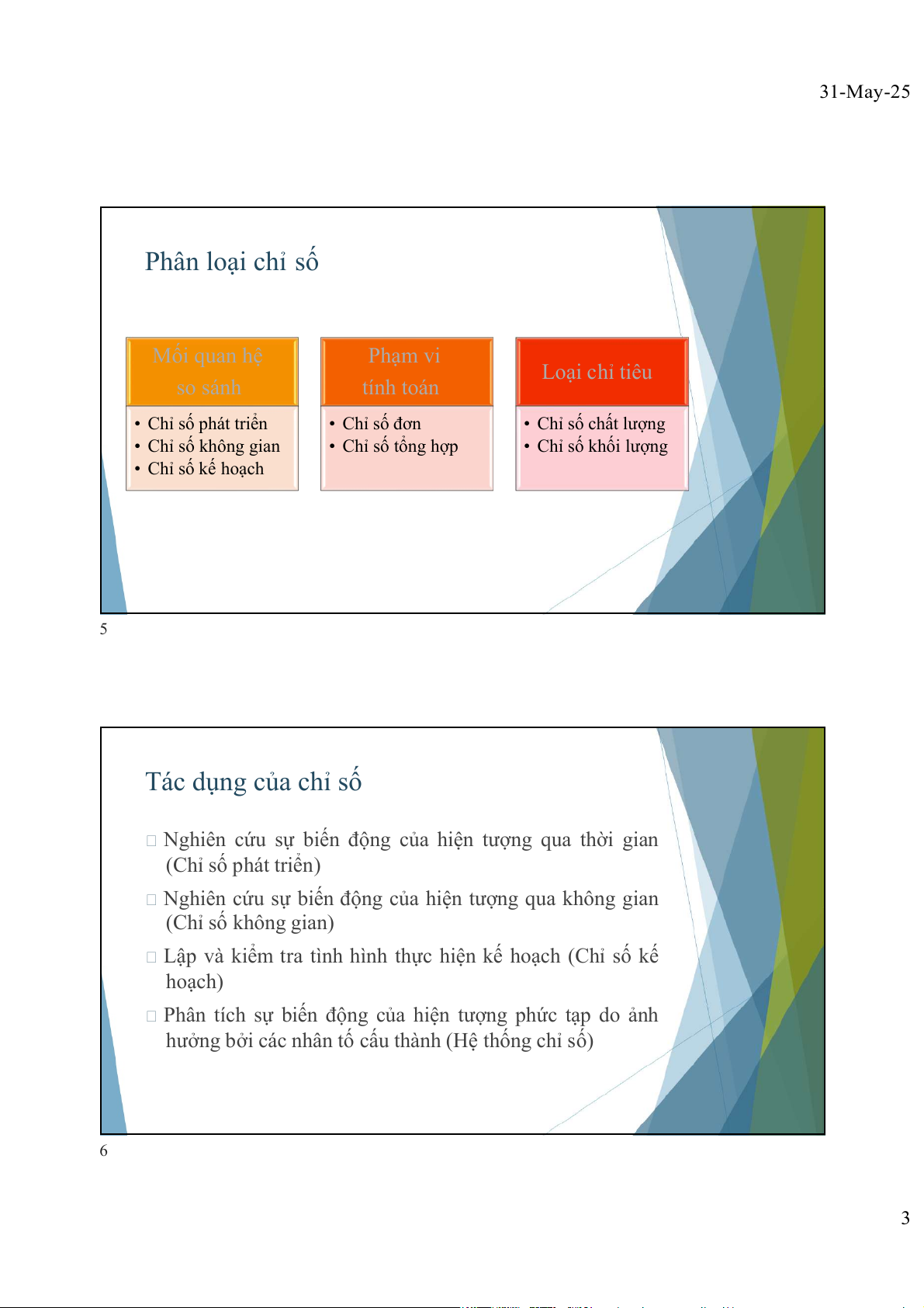 Thường tính theo đơn vị phần trăm (%). 4 2 31-May-25 Phân loại chỉ số Mối quan hệ Phạm vi Loại chỉ tiêu so sánh tính toán • Chỉ số phát triển • Chỉ số đơn • Chỉ số chất lượng • Chỉ số không gian • Chỉ số tổng hợp • Chỉ số khối lượng • Chỉ số kế hoạch 5 Tác dụng của chỉ số