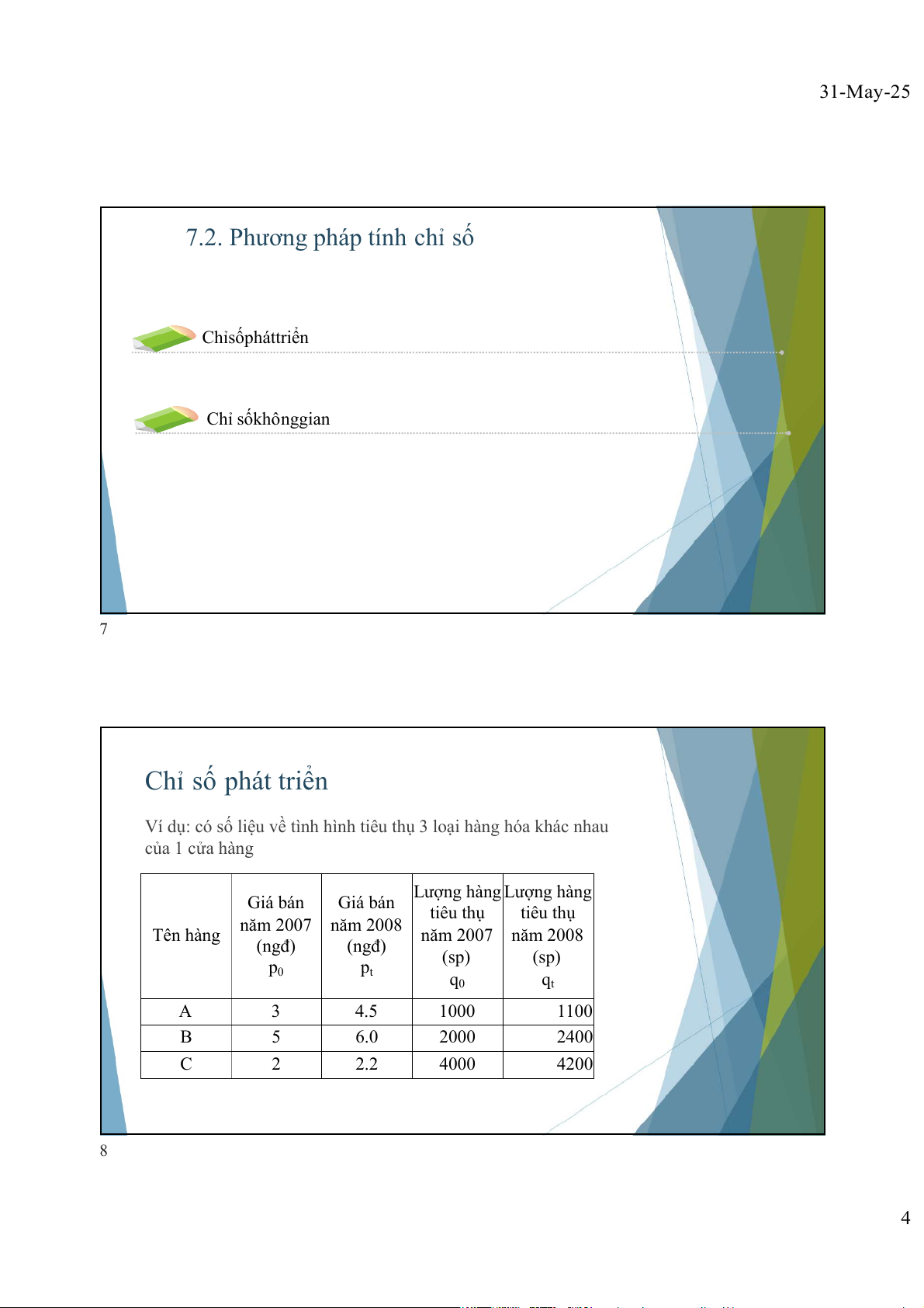 7.2. Phương pháp tính chỉ số Chỉsốpháttriển Chỉ sốkhônggian 7 Chỉ số phát triển