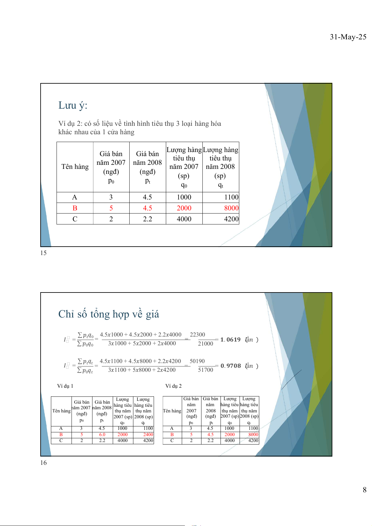 Giá bán Giá bán hàng tiêu hàng tiêu năm năm hàng tiêu hàng tiêu năm 2007 năm 2008 Tên hàng thụ năm thụ năm Tên hàng 2007 2008 thụ năm thụ năm (ngđ) (ngđ) 2007 (sp) 2008 (sp) (ngđ) (ngđ) 2007 (sp) 2008 (sp) p0 pt q0 qt p0 pt q0 qt A 3 4.5 1000 1100 A 3 4.5 1000 1100 B 5 6.0 2000 2400 B 5 4.5 2000 8000 C 2 2.2 4000 4200 C 2 2.2 4000 4200 16 8 31-May-25