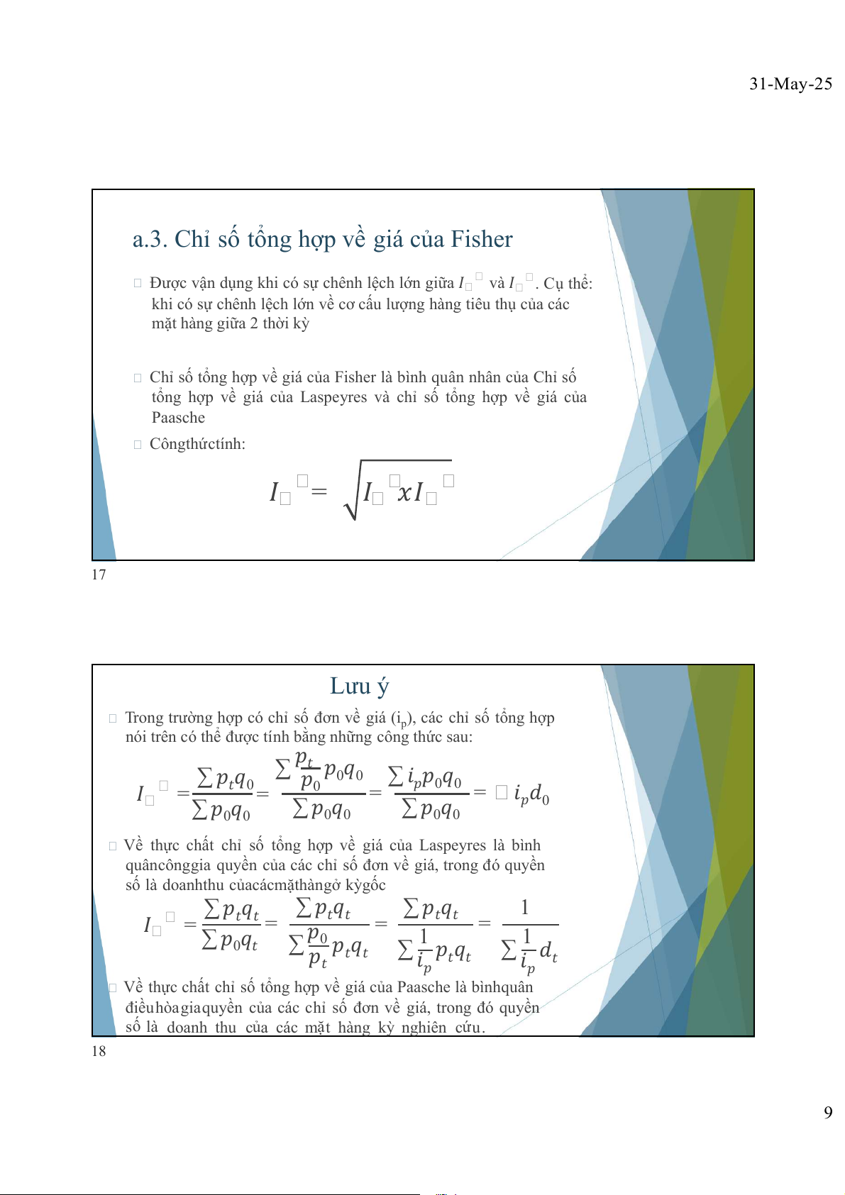 tổng hợp về giá của Laspeyres và chỉ số tổng hợp về giá của Paasche Côngthứctính: 𝐼 = 𝐼 𝑥𝐼 17 Lưu ý