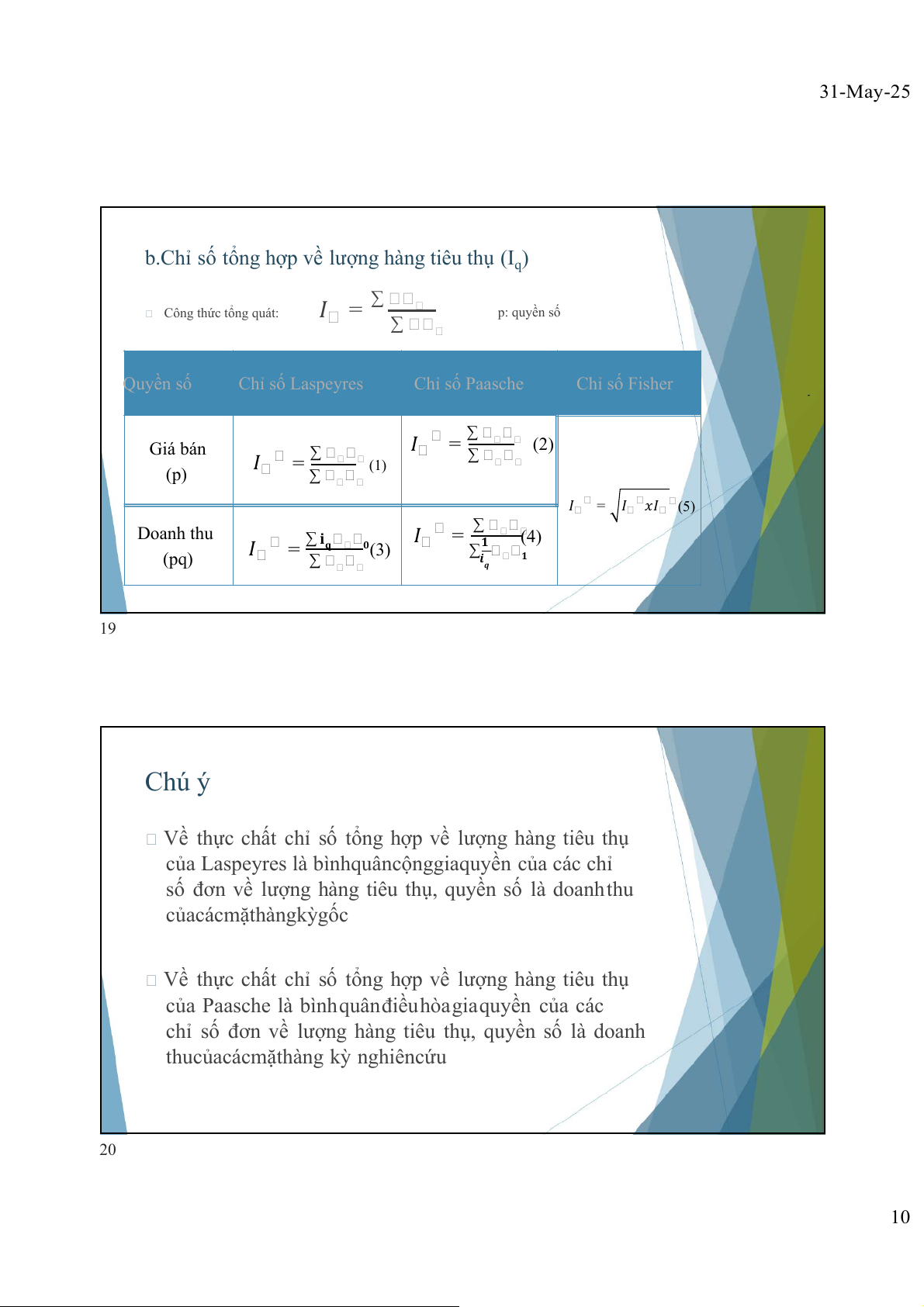 b.Chỉ số tổng hợp về lượng hàng tiêu thụ (I ) q Công thức tổng quát: 𝐼 = ∑ p: quyền số ∑ Quyền số Chỉ số Laspeyres Chỉ số Paasche Chỉ số Fisher Giá bán 𝐼 = ∑ (2) ∑ 𝐼 = ∑ (1) (p) ∑ 𝐼 = 𝐼 𝑥𝐼 (5) Doanh thu 𝐼 = ∑ (4) 𝐼 = ∑ 𝐢𝐪 𝟎(3) ∑𝟏 (pq) ∑ 𝒊 𝟏 𝒒 19 Chú ý