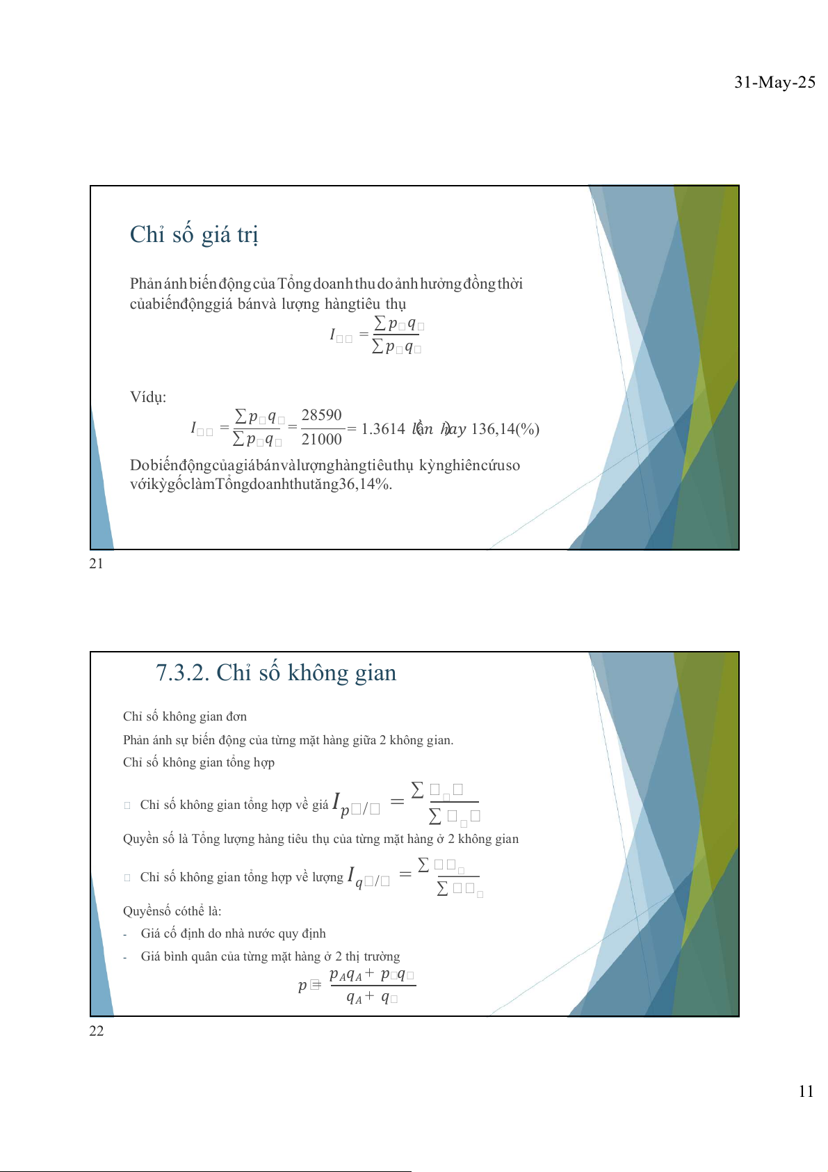 ộ giá bánvà lượng hàngtiêu thụ ∑ 𝑝 𝑞 𝐼 = ∑𝑝 𝑞 Víd : ụ ∑ 𝑝 𝑞 28590 𝐼 = = ∑
