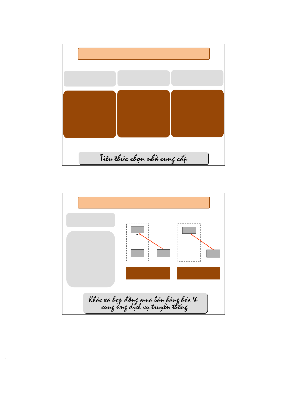 3.1 KHÁI NIỆM & QUY TRÌNH Công nghệ & Giá cả & Dịch vụ & chất lượng chi phí cam kết •Phương pháp •Giá đvị sp •Lịch giao hàng •Kinh nghiệm •Giá – khối lượng •Tính ổn định •Trang thiết bị •Điều khoản thanh •Tính linh hoạt •Tay nghề LD toán •Xử lý sự cố •Q.trình kiểm soát •Chi phí đặt hàng •Năng lực quản trị •Chi phí sửa chữa... 39 3.2 THUÊ NGOÀI TRONG CCU DN Khái niệm DN Việc di chuyển các hoạt động, quá trình NCC NCC kinh doanh trong tổ chức sang các NCC DN có thể thuê ngoài … hoặc toàn bộ hđ dịch vụ 1 phần/bộ phận... nào đó trong CCU bên ngoài 40 20
