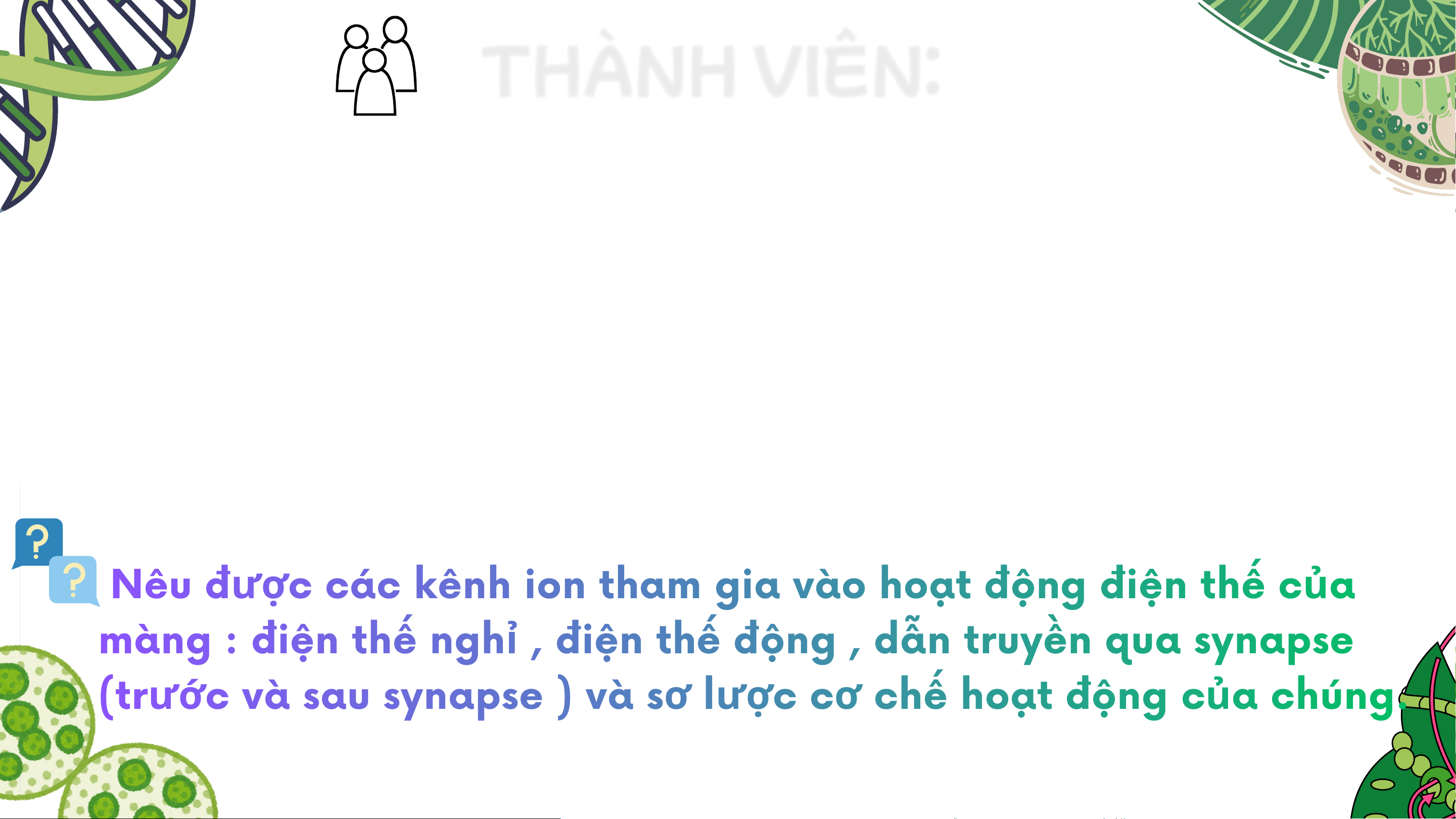 màng : điện thế nghỉ , điện thế động , dẫn truyền qua synapse