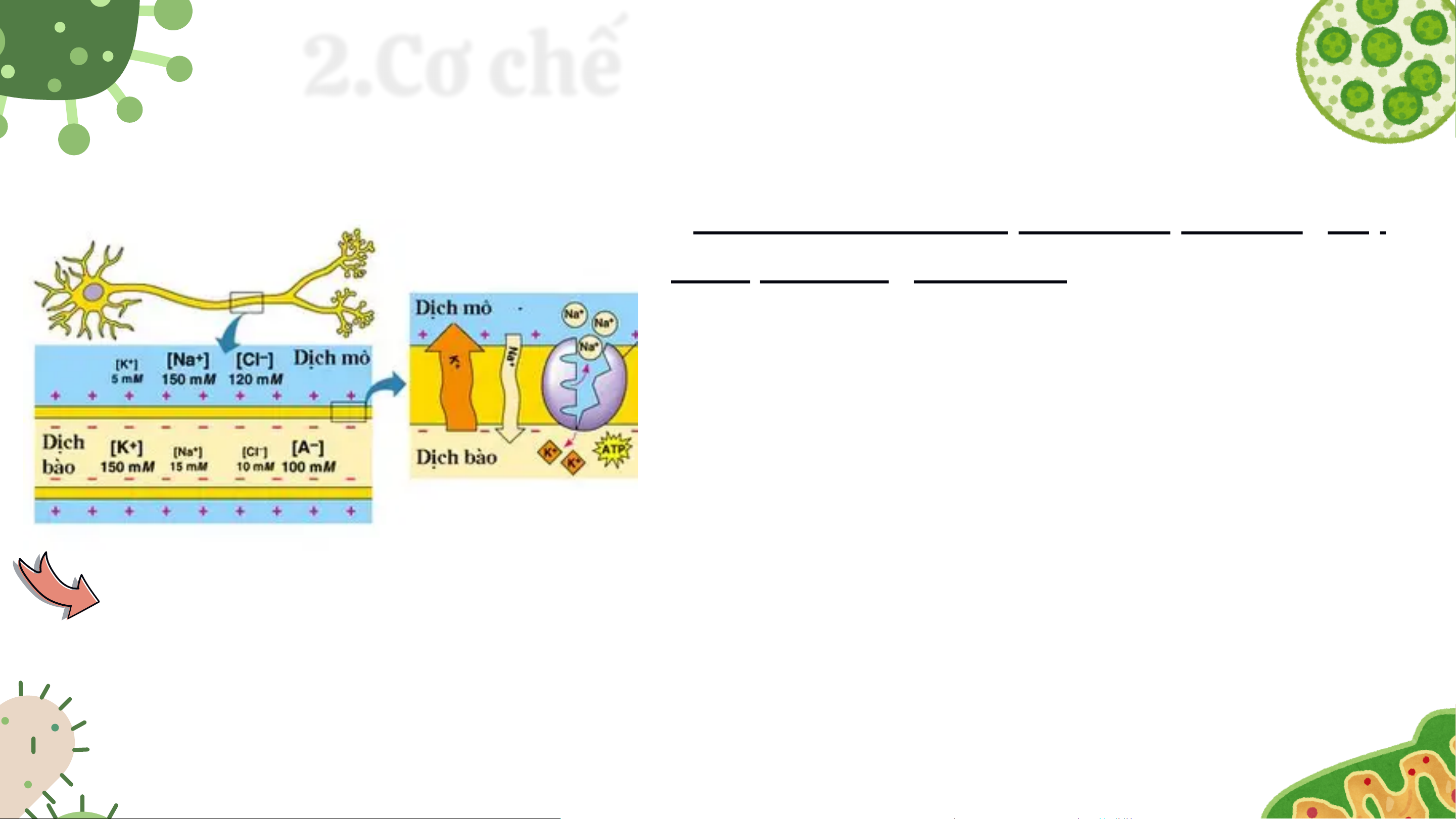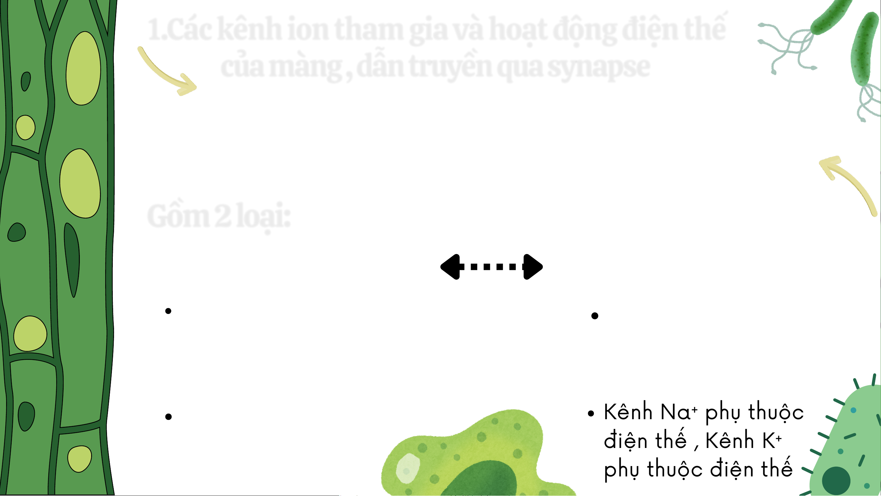 động của các kênh ion và bơm ion. Gồm 2 loại: Điện thế nghỉ Điện thế động Khi tế bào thần kinh Khi tế bào bị kích
