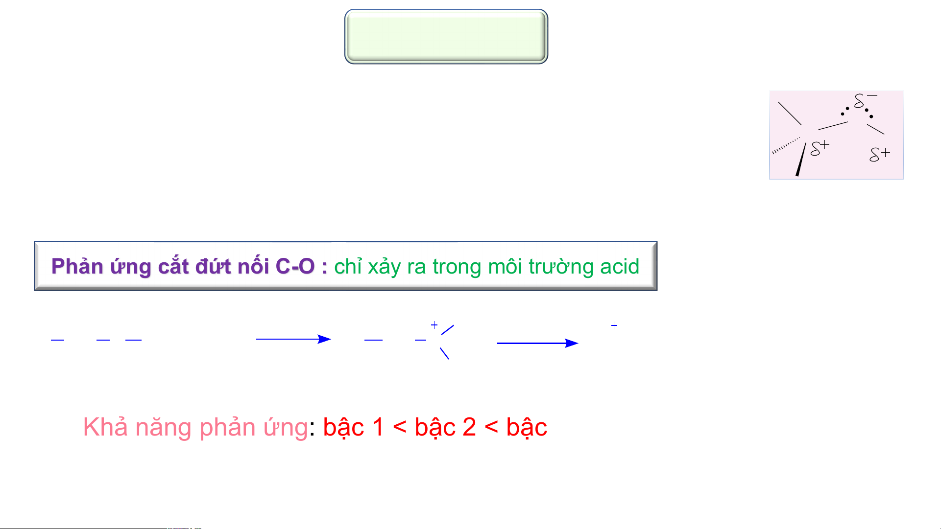 Phản ứng cắt đứt nối C-O : chỉ xảy ra trong môi trường acid H + H+ R CH2 O H R CH2 O R + H2O H