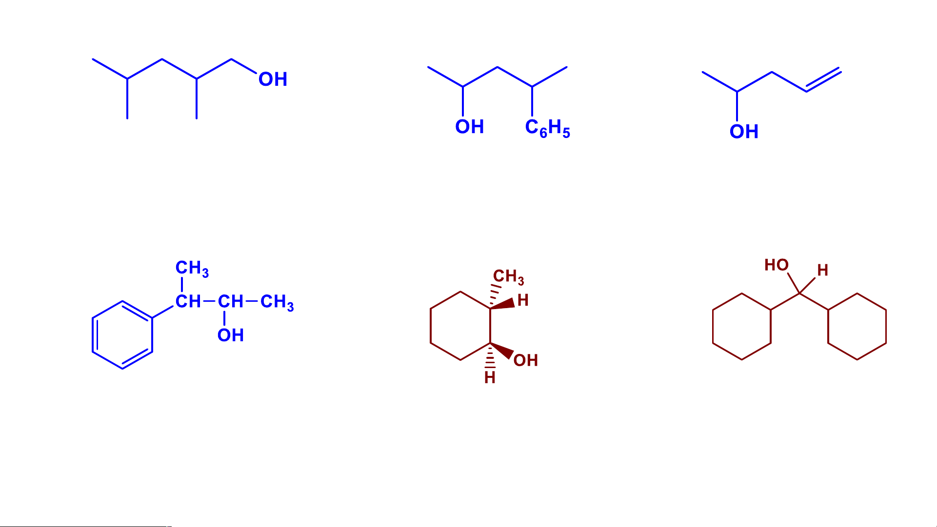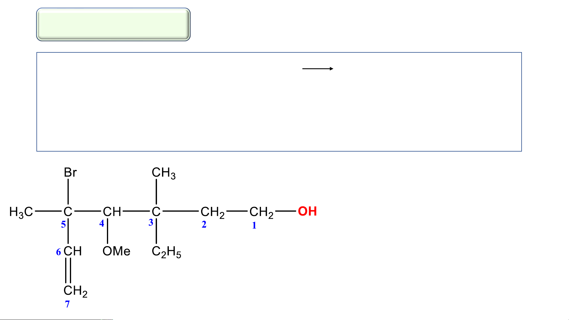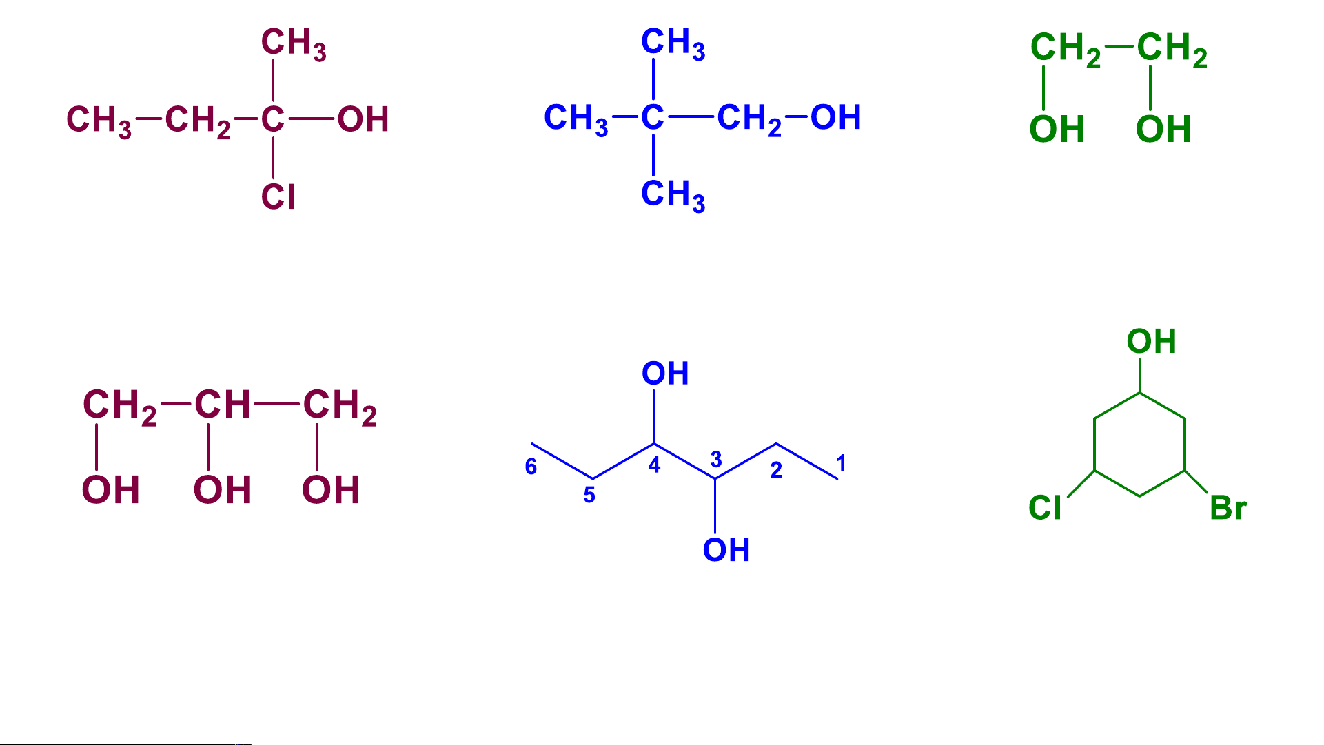 5-Bromo-3-ethyl-4-methoxy-3,5-dimethylhept-6-ene-1-ol CH H CH 3 CH CH2 OH C 2 OH C CH OH 2C HC CH CH Br 3 3 2-methylpropanol 2-methylprop-2-en-1-ol 1-bromoprop-2-yn-1-ol HO OH H OH 3C OH C2H5 Cl CH2OH phenylmethanol