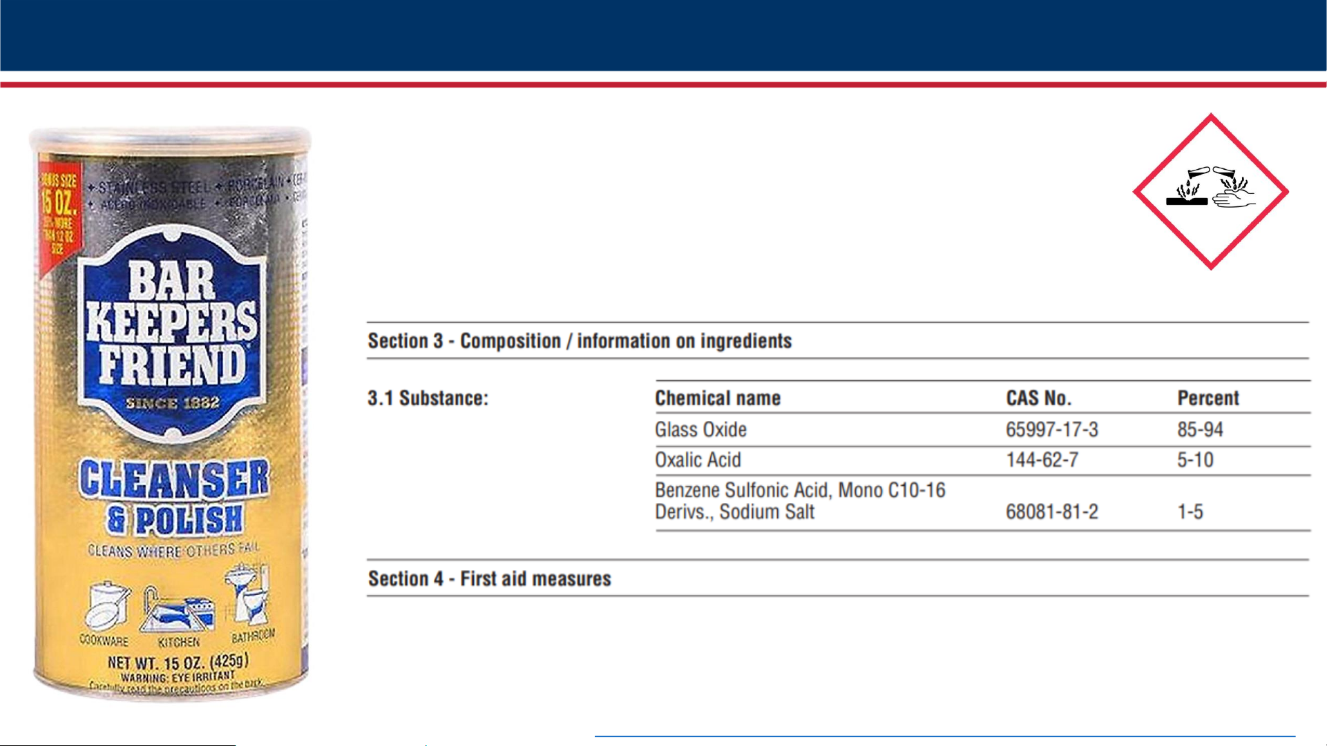 SerVaas Laboratories Inc., Bar Keepers Friend Cleanser Safety Data Sheet. https://www.barkeepersfriend.com/wp-content/uploads/2019/07/SDS-BKF-Cleanser-7-2-19.pdf