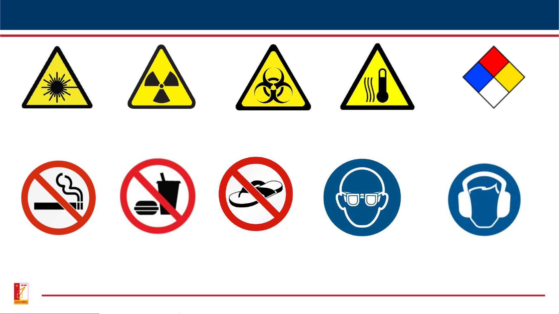 Một số biển báo ở ngoài và trong phòng thí nghiệm Tia laser nguy hiểm Bức xạ ion hóa Dễ lây nhiễm Nhiệt độ cao Có hóa chất Cấm hút thuốc Cấm ăn uống Cấm đi dép lê Phải đeo kính bảo hộ