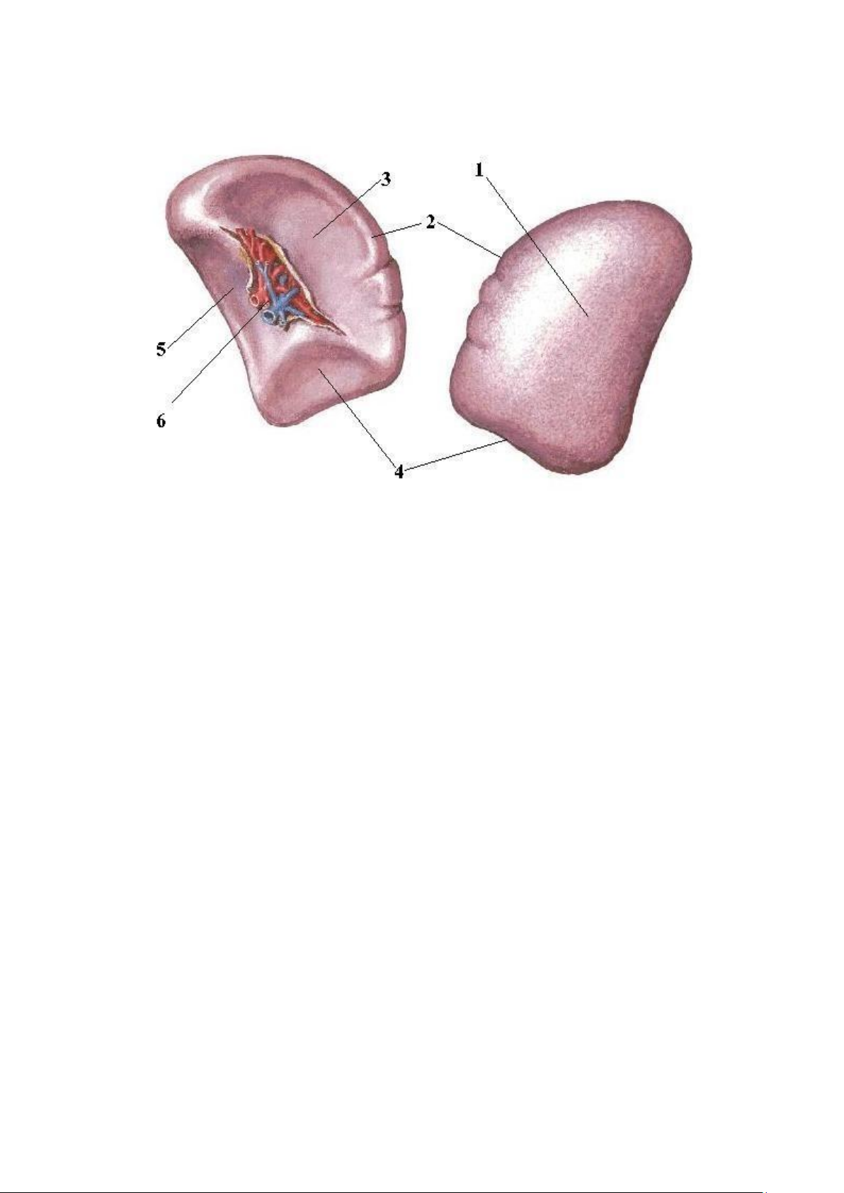 1. Cơ hoành 2. Dây chằng tam giác phải 3. Thùy phải 4. Bờ dưới 5. Túi mật 6. Dây chằng tròn gan
