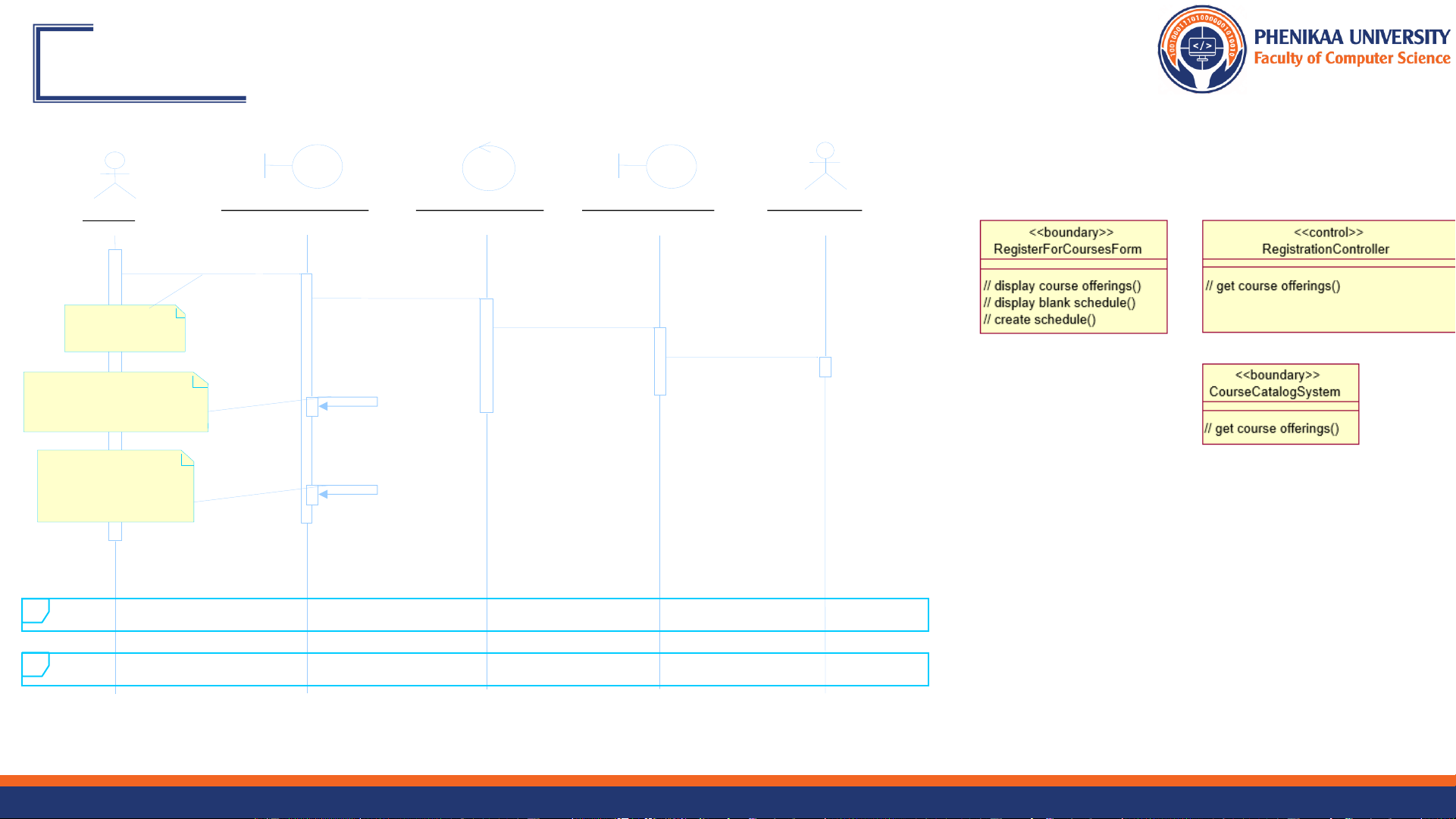 Example: Sequence Diagrams : RegisterForCoursesForm : RegistrationController : CourseCatalogSystem : Course Catalog : Student 1: // create schedule( ) 2: // get course offerings( ) Create a new