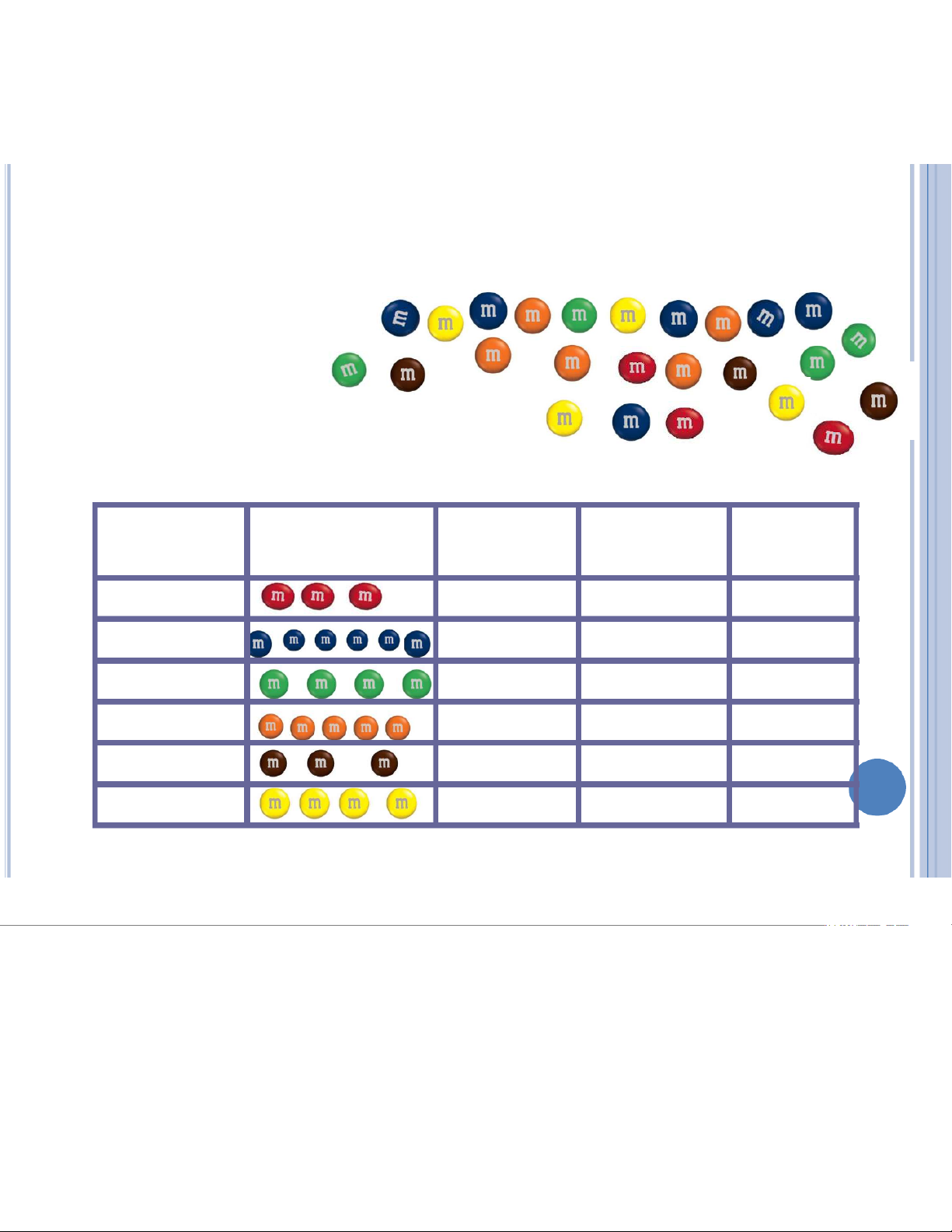 A bag of M&Ms contains 25 candies: Raw Data: Statistical Table: Color Tally Frequency Relative Percent Frequency Red 3 3/25 = .12 12% Blue 6 6/25 = .24 24% Green 4 4/25 = .16 16% Orange 5 5/25 = .20 20% Brown 3 3/25 = .12 12% Yellow 4 4/25 = .16 16% 21:05, 10/01/2026