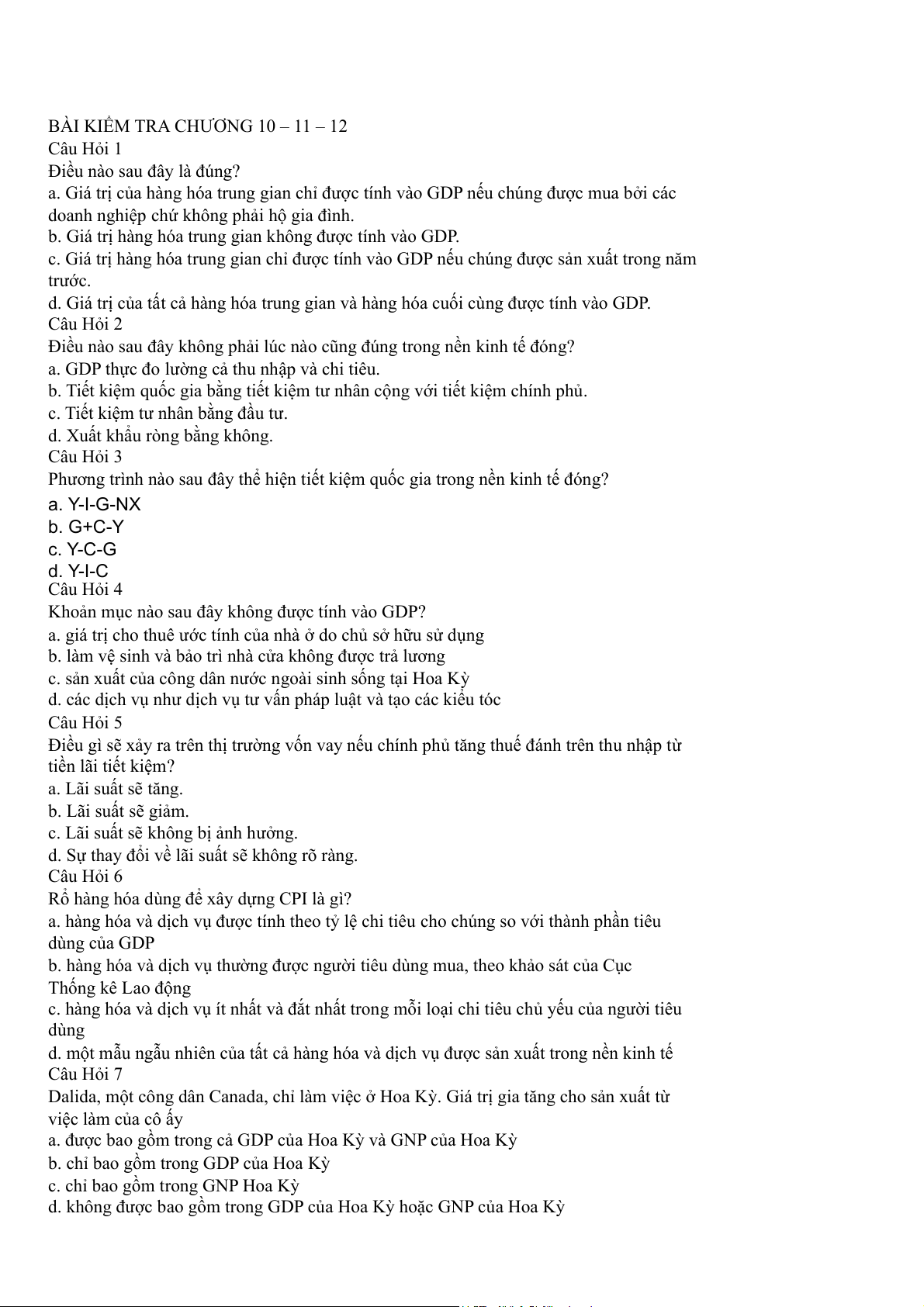 d. Giá trị của tất cả hàng hóa trung gian và hàng hóa cuối cùng được tính vào GDP. Câu Hỏi 2