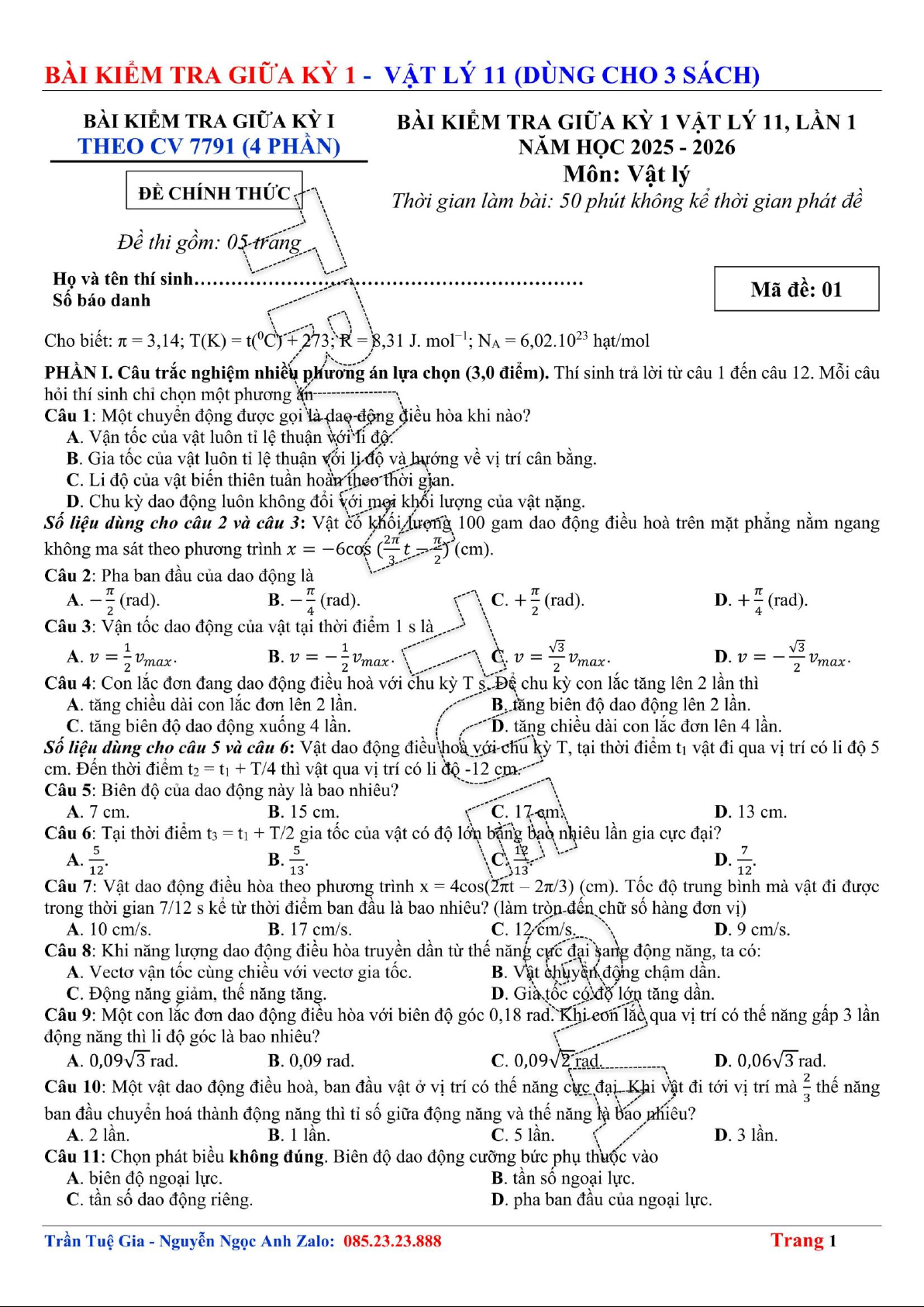 Bài kiểm tra giữa kỳ 1, lần 1 năm học 2025 – 2026 môn Vật lý 11