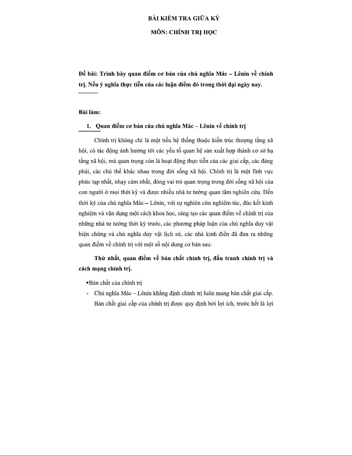 BÀI KIỂM TRA GIỮA KỲ Môn CHÍNH TRỊ HỌC: Quan Điểm Chủ Nghĩa Mác – Lênin