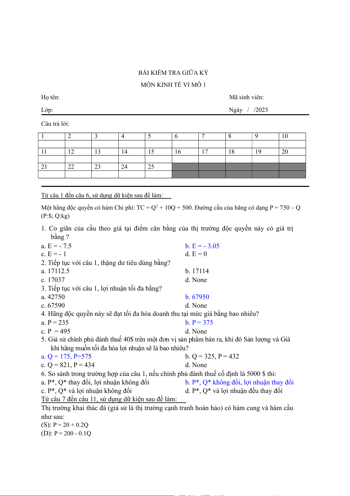 BÀI KIỂM TRA GIỮA KỲ MÔN KINH TẾ VI MÔ 1 Họ tên: Mã sinh viên: Lớp: Ngày / /2023 Câu trả lời: 1 2 3 4 5 6 7 8 9 10 11 12 13 14 15 16 17 18 19 20 21 22 23 24 25