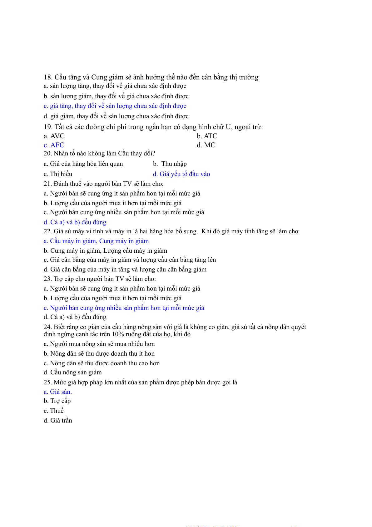 19. Tất cả các đường chi phí trong ngắn hạn có dạng hình chữ U, ngoại trừ: a. AVC b. ATC c. AFC d. MC