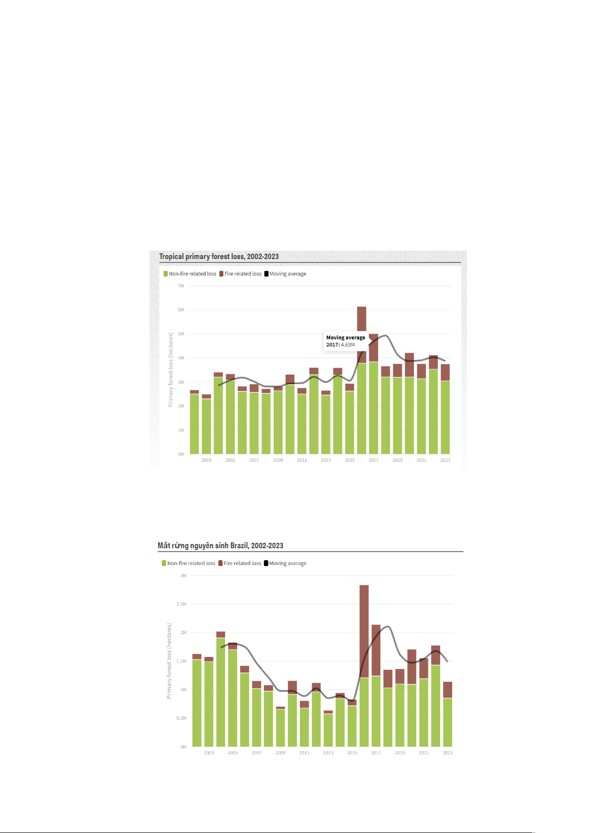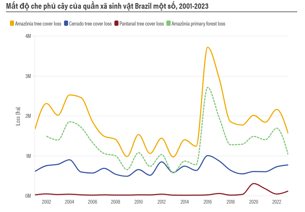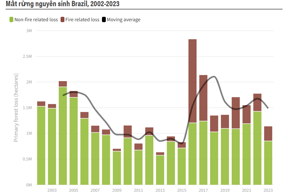 Brazil mất ít hơn 36% rừng nguyên sinh vào năm 2023 so với năm 2022, chạm mức thấp nhất kể từ năm 2015. Sự sụt giảm đó dẫn đến sự sụt giảm đáng kể tỷ lệ rừng nguyên sinh của Brazil trong tổng số rừng nguyên sinh ở vùng nhiệt đới - từ 43% tổng diện tích nhiệt đới vào năm 2022 xuống chỉ còn 30% tổng số vào năm 2023.