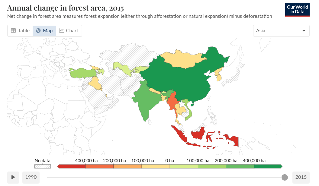 Bản đồ này cho thấy sự thay đổi ròng về diện tích rừng trên toàn thế giới. Các quốc gia có sự thay đổi tích cực (hiển thị màu xanh lá cây) đang tăng diện tích rừng nhanh hơn tốc độ mất rừng. Các quốc gia có sự thay đổi tiêu cực (hiển thị màu đỏ) đang mất nhiều hơn khả năng phục hồi.